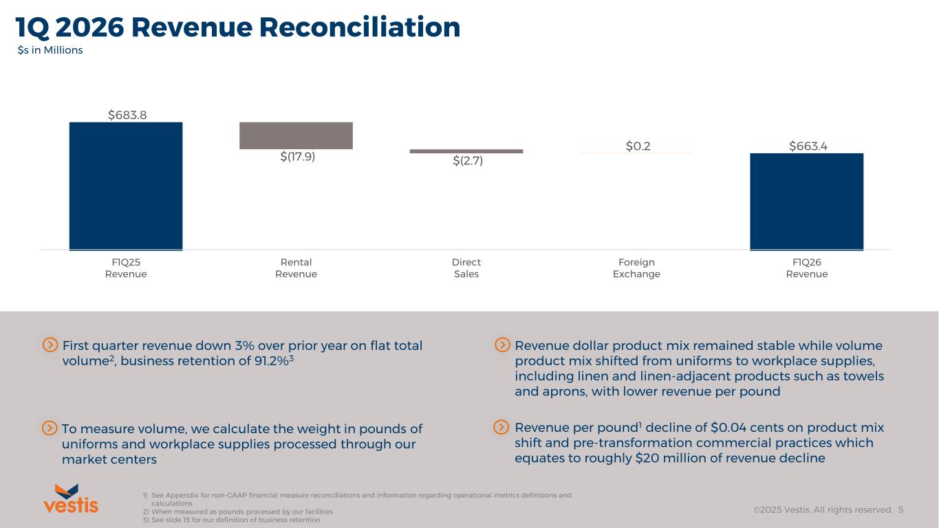 1Q 2026 Financial Summary ©2025 Vestis. All rights reserved. 4 Revenue $s in Millions Adjusted EBITDA1 $s in Millions & % of Revenue 1) See Appendix for non-GAAP financial measure reconciliations and information regarding operational metrics definitions and calculations 2) When measured as pounds processed by our facilities Adjusted Free Cash Flow1 $s in Millions Revenue of $663.4 million o A decrease of $20.4 million year over year or 3.0% o Consistent total volume2 o Rental revenue decreased $17.9 million o Direct sales decreased $2.7 million o Benefit from foreign exchange on currency of $0.2 million Adjusted EBITDA1 of $70.4 million, or 10.6% of revenue o Decline of $10.8 million year over year or 13.3% o Improvements in adjusted operating expenses1 resulting from strategic business transformation o Increased sequentially compared to the fourth quarter of fiscal 2025, when adjusted EBITDA1 was $64.6 million, or 9.1% of revenue Free Cash Flow 1 of $28.3 million and Adjusted Free Cash Flow1 of $42.9 million o Free Cash Flow1 improvement of $39.3 million year over year o Includes $12.7 million of working capital contributions o Adjusted Free Cash Flow1 excludes $14.6 million of business transformation cash payments o Total available liquidity of $316.7 million including $41.5 million cash and cash equivalents on hand as of January 2, 2026 Adjusted Diluted EPS1 of $0.10 per share Adjusted Diluted EPS1 $s in Dollars F1Q25 F1Q26 F1Q25 F1Q26 F1Q25 F1Q26 F1Q25 F1Q26 $684 $663 $81 $70 11.9% 10.6% $(11) $43 $0.14 $0.10