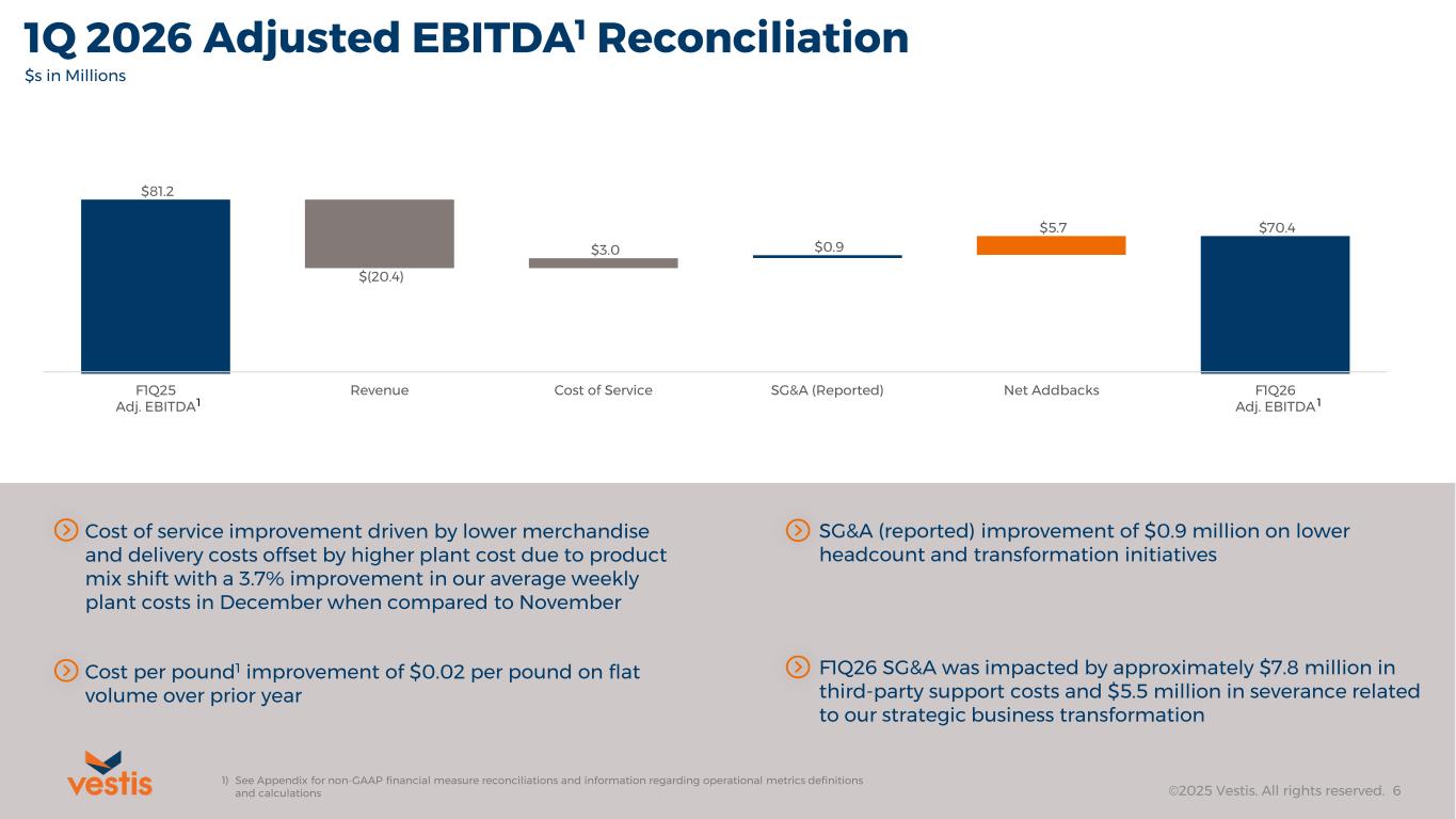 ©2025 Vestis. All rights reserved. 5 1Q 2026 Revenue Reconciliation $683.8 $(17.9) $(2.7) $0.2 $663.4 F1Q25 Revenue Rental Revenue Direct Sales Foreign Exchange F1Q26 Revenue $s in Millions Revenue per pound1 decline of $0.04 cents on product mix shift and pre-transformation commercial practices which equates to roughly $20 million of revenue decline To measure volume, we calculate the weight in pounds of uniforms and workplace supplies processed through our market centers First quarter revenue down 3% over prior year on flat total volume2, business retention of 91.2%3 Revenue dollar product mix remained stable while volume product mix shifted from uniforms to workplace supplies, including linen and linen-adjacent products such as towels and aprons, with lower revenue per pound 1) See Appendix for non-GAAP financial measure reconciliations and information regarding operational metrics definitions and calculations 2) When measured as pounds processed by our facilities 3) See slide 15 for our definition of business retention