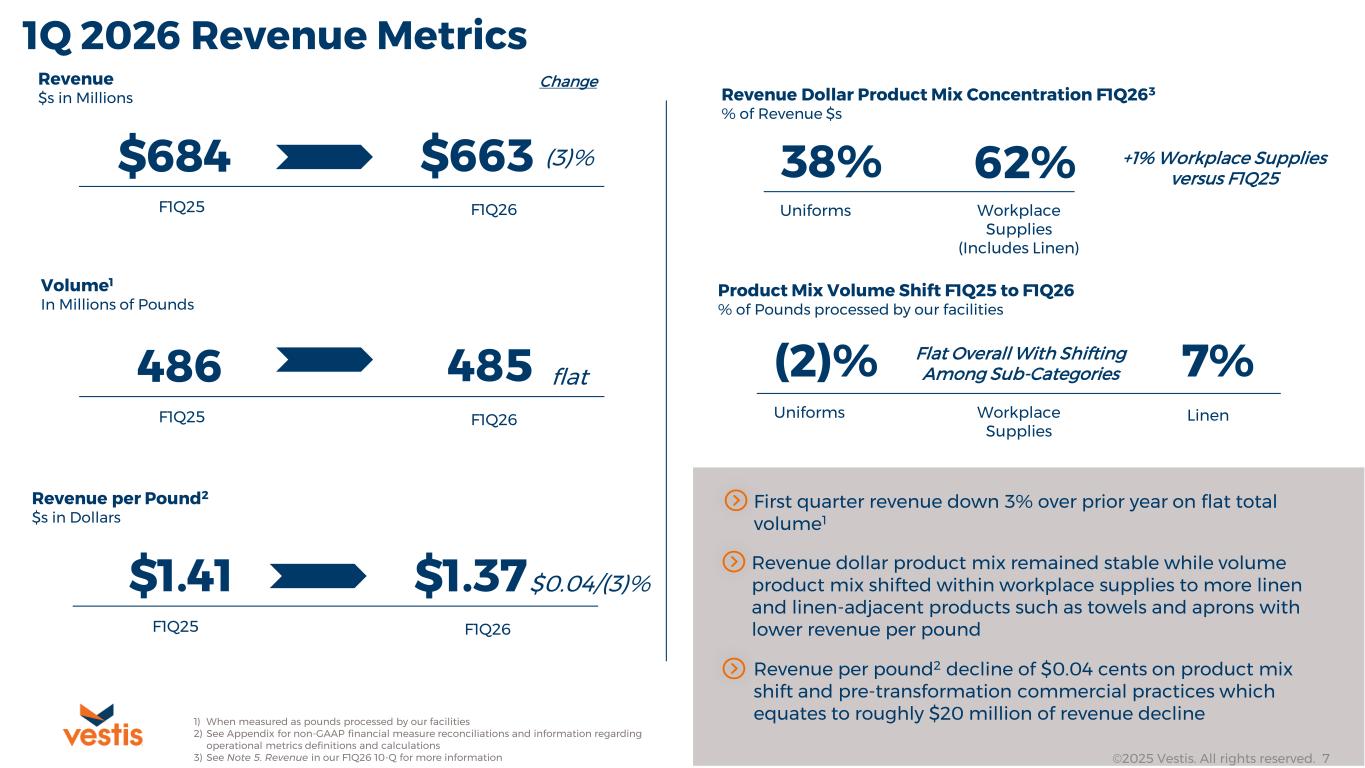 ©2025 Vestis. All rights reserved. 6 1Q 2026 Adjusted EBITDA1 Reconciliation $81.2 $(20.4) $3.0 $0.9 $5.7 $70.4 F1Q25 Adj. EBITDA Revenue Cost of Service SG&A (Reported) Net Addbacks F1Q26 Adj. EBITDA $s in Millions SG&A (reported) improvement of $0.9 million on lower headcount and transformation initiatives Cost of service improvement driven by lower merchandise and delivery costs offset by higher plant cost due to product mix shift with a 3.7% improvement in our average weekly plant costs in December when compared to November Cost per pound1 improvement of $0.02 per pound on flat volume over prior year F1Q26 SG&A was impacted by approximately $7.8 million in third-party support costs and $5.5 million in severance related to our strategic business transformation 1) See Appendix for non-GAAP financial measure reconciliations and information regarding operational metrics definitions and calculations 1 1