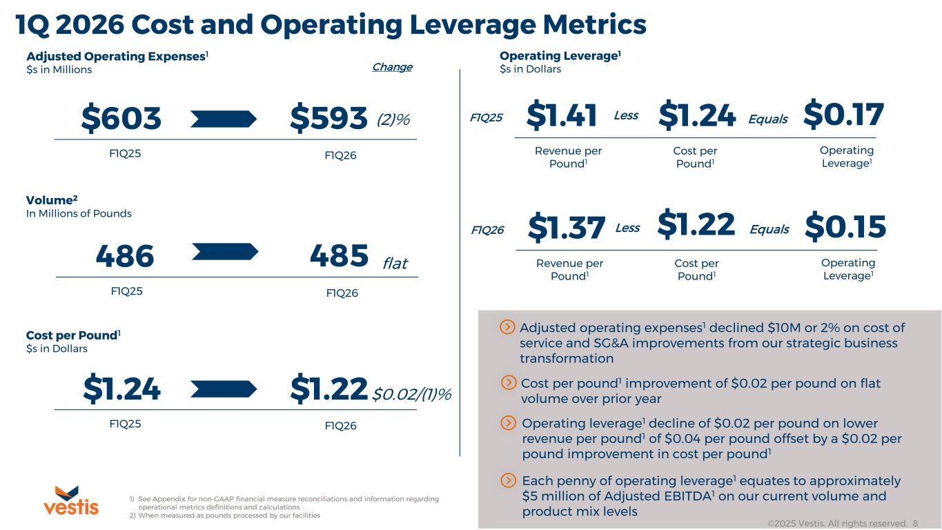 Vestis Confidential ©2025 Vestis. All rights reserved. 7 1Q 2026 Revenue Metrics Revenue $s in Millions F1Q25 F1Q26 $684 $663 Volume1 In Millions of Pounds 1) When measured as pounds processed by our facilities 2) See Appendix for non-GAAP financial measure reconciliations and information regarding operational metrics definitions and calculations 3) See Note 5. Revenue in our F1Q26 10-Q for more information (3)% F1Q25 F1Q26 486 485 flat Revenue per Pound2 $s in Dollars F1Q25 F1Q26 $1.41 $0.04/(3)%$1.37 Product Mix Volume Shift F1Q25 to F1Q26 % of Pounds processed by our facilities Uniforms Workplace Supplies Linen Flat Overall With Shifting Among Sub-Categories(2)% 7% Revenue per pound2 decline of $0.04 cents on product mix shift and pre-transformation commercial practices which equates to roughly $20 million of revenue decline First quarter revenue down 3% over prior year on flat total volume1 Revenue Dollar Product Mix Concentration F1Q263 % of Revenue $s Uniforms Workplace Supplies (Includes Linen) 38% 62% Change +1% Workplace Supplies versus F1Q25 Revenue dollar product mix remained stable while volume product mix shifted within workplace supplies to more linen and linen-adjacent products such as towels and aprons with lower revenue per pound ©2025 Vestis. All rights reserved. 7