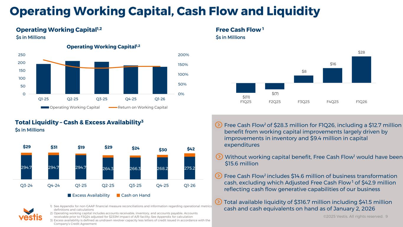 Vestis Confidential ©2025 Vestis. All rights reserved. 8 1Q 2026 Cost and Operating Leverage Metrics Adjusted Operating Expenses1 $s in Millions F1Q25 F1Q26 $603 $593 Volume2 In Millions of Pounds 1) See Appendix for non-GAAP financial measure reconciliations and information regarding operational metrics definitions and calculations 2) When measured as pounds processed by our facilities (2)% F1Q25 F1Q26 486 485 flat Cost per Pound1 $s in Dollars F1Q25 F1Q26 $1.24 $0.02/(1)%$1.22 Operating Leverage1 $s in Dollars Revenue per Pound1 Cost per Pound1 Operating Leverage1 Less$1.41 $0.17 Operating leverage1 decline of $0.02 per pound on lower revenue per pound1 of $0.04 per pound offset by a $0.02 per pound improvement in cost per pound1 Adjusted operating expenses1 declined $10M or 2% on cost of service and SG&A improvements from our strategic business transformation Change Cost per pound1 improvement of $0.02 per pound on flat volume over prior year F1Q25 $1.24 Equals Revenue per Pound1 Cost per Pound1 Operating Leverage1 Less$1.37 $0.15F1Q26 Equals$1.22 Each penny of operating leverage1 equates to approximately $5 million of Adjusted EBITDA1 on our curre t volume and product mix levels ©2025 Vestis. All rights reserved. 8