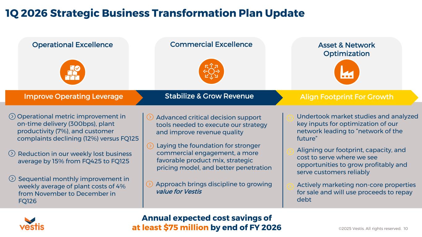 Operating Working Capital, Cash Flow and Liquidity ©2025 Vestis. All rights reserved. 9 Operating Working Capital1,2 $s in Millions Total Liquidity – Cash & Excess Availability3 $s in Millions Free Cash Flow 1 $s in Millions 1) See Appendix for non-GAAP financial measure reconciliations and information regarding operational metrics definitions and calculations 2) Operating working capital includes accounts receivable, inventory, and accounts payable; Accounts receivable prior to F3Q24 adjusted for $233M impact of A/R facility; See Appendix for calculation 3) Excess availability is defined as undrawn revolver capacity less letters of credit issued in accordance with the Company’s Credit Agreement Free Cash Flow1 of $28.3 million for F1Q26, including a $12.7 million benefit from working capital improvements largely driven by improvements in inventory and $9.4 million in capital expenditures $268$266$264 $295$295 0% 50% 100% 150% 200% 0 50 100 150 200 250 Q1-25 Q2-25 Q3-25 Q4-25 Q1-26 Operating Working Capital1,2 Operating Working Capital Return on Working Capital 294.7 294.7 294.7 264.3 266.3 268.2 275.2 $29 $31 $19 $29 $24 $30 $42 Q3-24 Q4-24 Q1-25 Q2-25 Q3-25 Q4-25 Q1-26 Excess Availability Cash on Hand $(11) $(7) $8 $16 $28 F1Q25 F2Q25 F3Q25 F4Q25 F1Q26 Without working capital benefit, Free Cash Flow1 would have been $15.6 million Free Cash Flow1 includes $14.6 million of business transformation cash, excluding which Adjusted Free Cash Flow 1 of $42.9 million reflecting cash flow generative capabilities of our business Total available liquidity of $316.7 million including $41.5 million cash and cash equivalents on hand as of January 2, 2026