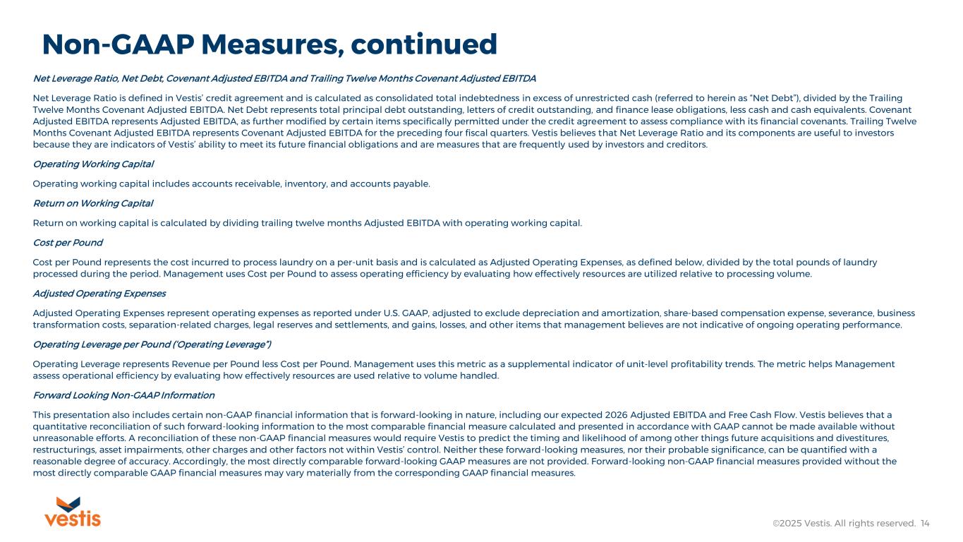 Non-GAAP Measures ©2025 Vestis. All rights reserved. 13 Vestis reports its financial results in accordance with U.S. GAAP, but in this presentation and the non-GAAP reconciliations that follow, Vestis also uses the following non-GAAP measures: Adjusted EBITDA, Adjusted EBITDA Margin, Adjusted Net Income (Loss), Adjusted Basic EPS, Adjusted Diluted EPS, Free Cash Flow, Adjusted Free Cash Flow, Operating Working Capital, Net Debt, Net Leverage Ratio, Operating Leverage, Trailing Twelve Months Covenant Adjusted EBITDA, Return on Working Capital, Adjusted Operating Expenses, Cost per Pound and Operating Leverage. Vestis believes that non-GAAP financial measures, when considered together with the corresponding U.S. GAAP financial measure, provide useful supplemental information to investors. Certain adjustment-based measures exclude items that management believes may not be indicative of or are unrelated to Vestis’ core operating results. Vestis uses these non-GAAP financial measures with U.S. GAAP financial measures and other operating data to assist in the evaluation of its operating performance. Vestis believes that presentation of these measures also helps investors because the measures enable better comparisons of Vestis’ historical results and allow investors to evaluate Vestis’ performance based on the same metrics that Vestis uses to evaluate its performance and trends in its results. However, these measures have limitations as analytical tools and should not be considered in isolation or as a substitute for Vestis’ results as reported under U.S. GAAP. Specifically, you should not consider these measures as alternatives to revenue, operating income, operating expenses, net income (Loss), net income margin or net cash provided by operating activities determined in accordance with U.S. GAAP. These non-GAAP financial measures also should not be considered as measures of cash available to Vestis to invest in the growth of Vestis’ business or cash that will be available to Vestis to meet its obligations. Non-GAAP financial measures as presented by Vestis may not be comparable to other similarly titled measures of other companies because not all companies use identical calculations. Reconciliations of non-GAAP financial measures to the most directly comparable U.S.GAAP measures are provided in the tables at the end of this presentation. Adjusted EBITDA Adjusted EBITDA represents net income adjusted for provision for income taxes; interest expense, net; and depreciation and amortization (EBITDA), further adjusted for share-based compensation expense; severance; business transformation costs; separation related charges; securitization fees; loss (gain) on sale of equity investments; third party debt amendment fees; legal reserves and settlements; gains, losses, and other items impacting comparability. Adjusted EBITDA is presented to provide a more meaningful comparison of Vestis’ operating performance by excluding items that management believes are not reflective of ongoing operations or that may obscure trends in the underlying business. Similar adjustments have been recorded in Adjusted EBITDA for earlier periods, and Vestis may record similar types of adjustments in future periods. Adjusted EBITDA Margin Adjusted EBITDA Margin represents Adjusted EBITDA as a percentage of Revenue. Adjusted Net Income (Loss), Adjusted Basic EPS and Adjusted Diluted EPS Adjusted Net Income (Loss) represents net income (loss) adjusted to exclude items not considered indicative of Vestis’ core ongoing operations, including amortization expense, share-based compensation, severance charges, business transformation costs, separation-related charges, loss (gain) on sale of equity investments; third party debt amendment fees; legal reserves and settlements; gains, losses, and other items impacting comparability. Management believes this measure provides useful supplemental information by facilitating period-over-period comparisons of performance on a consistent basis. Adjusted Basic EPS and Adjusted Diluted EPS represent Adjusted Net Income (Loss) divided by the weighted-average number of basic and diluted shares outstanding, respectively. Free Cash Flow and Adjusted Free Cash Flow Free Cash Flow represents net cash provided by operating activities adjusted for purchases of property and equipment and other items. Free Cash Flow is presented because it reflects the cash generated from operations after capital expenditures necessary to maintain and improve operations. Free cash flow does not represent the residual cash flow available for discretionary expenditures, as there may be other nondiscretionary cash requirements not reflected in this measure. Adjusted Free Cash Flow represents Free Cash Flow adjusted for cash paid for strategic business transformation initiatives, including transformation-related severance and third-party advisory fees.