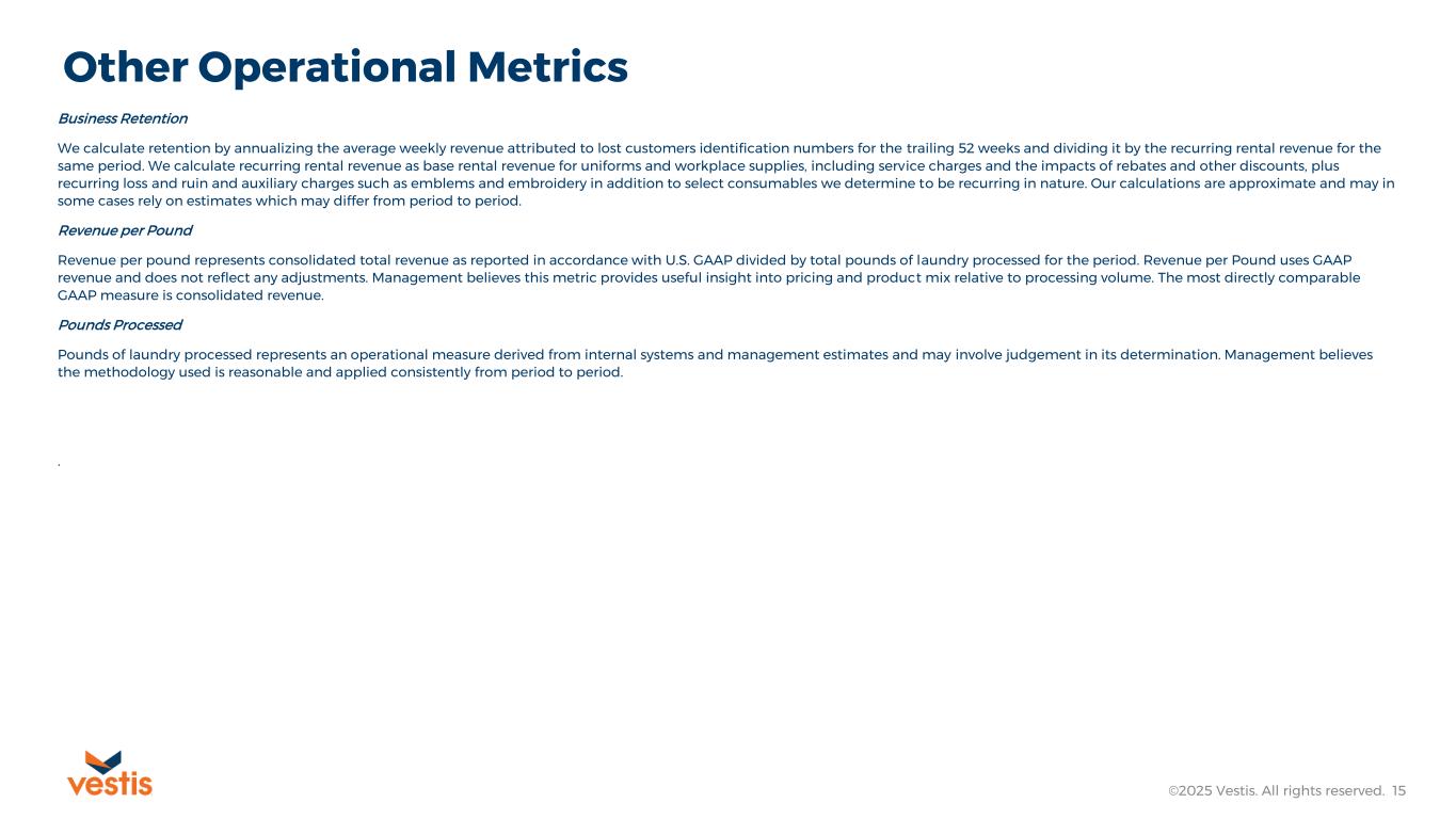 ©2025 Vestis. All rights reserved. 15 Other Operational Metrics Business Retention We calculate retention by annualizing the average weekly revenue attributed to lost customers identification numbers for the trailing 52 weeks and dividing it by the recurring rental revenue for the same period. We calculate recurring rental revenue as base rental revenue for uniforms and workplace supplies, including service charges and the impacts of rebates and other discounts, plus recurring loss and ruin and auxiliary charges such as emblems and embroidery in addition to select consumables we determine to be recurring in nature. Our calculations are approximate and may in some cases rely on estimates which may differ from period to period. Revenue per Pound Revenue per pound represents consolidated total revenue as reported in accordance with U.S. GAAP divided by total pounds of laundry processed for the period. Revenue per Pound uses GAAP revenue and does not reflect any adjustments. Management believes this metric provides useful insight into pricing and product mix relative to processing volume. The most directly comparable GAAP measure is consolidated revenue. Pounds Processed Pounds of laundry processed represents an operational measure derived from internal systems and management estimates and may involve judgement in its determination. Management believes the methodology used is reasonable and applied consistently from period to period. .
