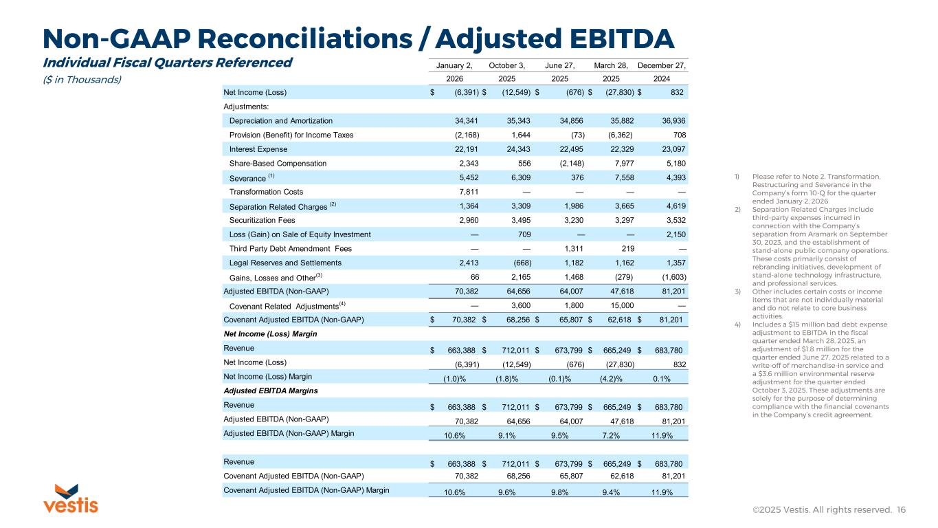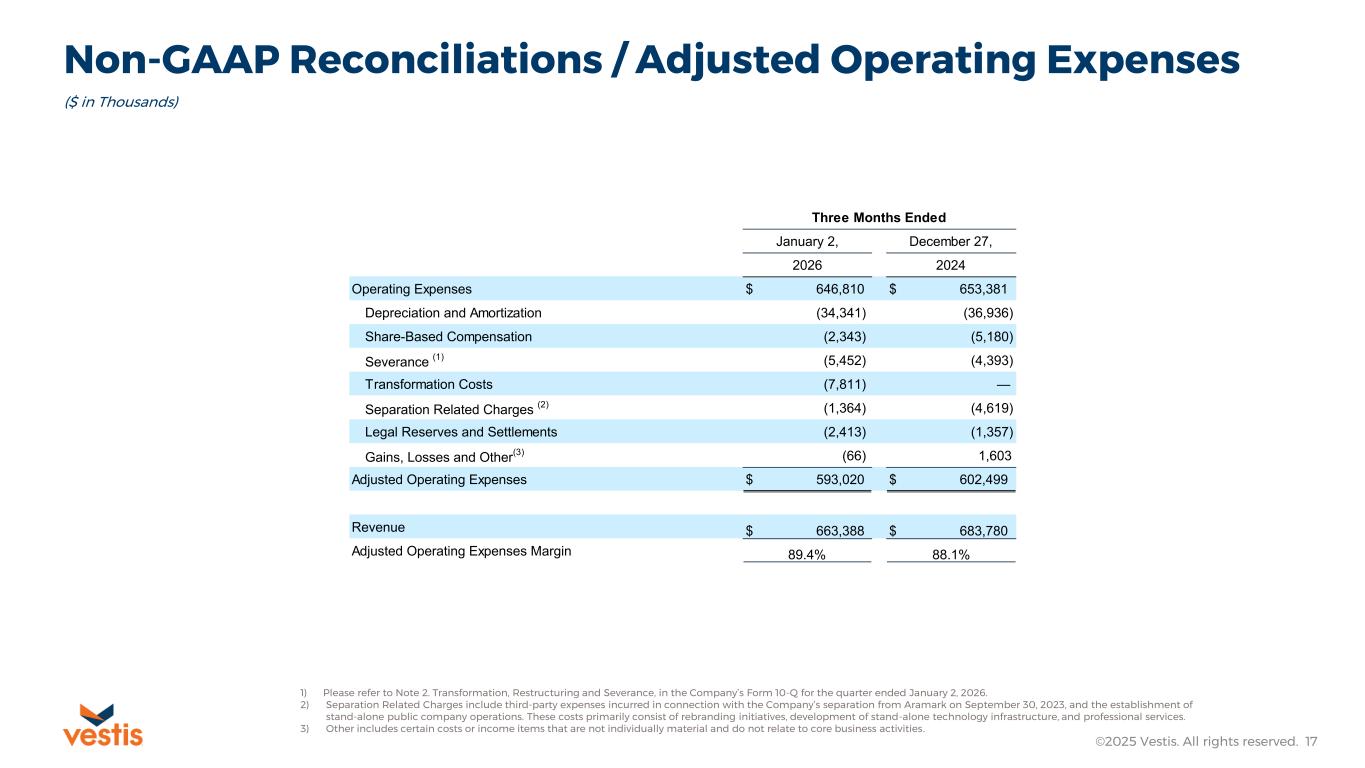 Non-GAAP Reconciliations / Adjusted EBITDA ©2025 Vestis. All rights reserved. 16 ($ in Thousands) 1) Please refer to Note 2. Transformation, Restructuring and Severance in the Company’s form 10-Q for the quarter ended January 2, 2026 2) Separation Related Charges include third-party expenses incurred in connection with the Company’s separation from Aramark on September 30, 2023, and the establishment of stand-alone public company operations. These costs primarily consist of rebranding initiatives, development of stand-alone technology infrastructure, and professional services. 3) Other includes certain costs or income items that are not individually material and do not relate to core business activities. 4) Includes a $15 million bad debt expense adjustment to EBITDA in the fiscal quarter ended March 28, 2025, an adjustment of $1.8 million for the quarter ended June 27, 2025 related to a write-off of merchandise-in service and a $3.6 million environmental reserve adjustment for the quarter ended October 3, 2025. These adjustments are solely for the purpose of determining compliance with the financial covenants in the Company’s credit agreement. Individual Fiscal Quarters Referenced January 2, October 3, June 27, March 28, December 27, 2026 2025 2025 2025 2024 Net Income (Loss) $ (6,391) $ (12,549) $ (676) $ (27,830) $ 832 Adjustments: Depreciation and Amortization 34,341 35,343 34,856 35,882 36,936 Provision (Benefit) for Income Taxes (2,168) 1,644 (73) (6,362) 708 Interest Expense 22,191 24,343 22,495 22,329 23,097 Share-Based Compensation 2,343 556 (2,148) 7,977 5,180 Severance (1) 5,452 6,309 376 7,558 4,393 Transformation Costs 7,811 — — — — Separation Related Charges (2) 1,364 3,309 1,986 3,665 4,619 Securitization Fees 2,960 3,495 3,230 3,297 3,532 Loss (Gain) on Sale of Equity Investment — 709 — — 2,150 Third Party Debt Amendment Fees — — 1,311 219 — Legal Reserves and Settlements 2,413 (668) 1,182 1,162 1,357 Gains, Losses and Other (3) 66 2,165 1,468 (279) (1,603) Adjusted EBITDA (Non-GAAP) 70,382 64,656 64,007 47,618 81,201 Covenant Related Adjustments (4) — 3,600 1,800 15,000 — Covenant Adjusted EBITDA (Non-GAAP) $ 70,382 $ 68,256 $ 65,807 $ 62,618 $ 81,201 Net Income (Loss) Margin Revenue $ 663,388 $ 712,011 $ 673,799 $ 665,249 $ 683,780 Net Income (Loss) (6,391) (12,549) (676) (27,830) 832 Net Income (Loss) Margin (1.0)% (1.8)% (0.1)% (4.2)% 0.1% Adjusted EBITDA Margins Revenue $ 663,388 $ 712,011 $ 673,799 $ 665,249 $ 683,780 Adjusted EBITDA (Non-GAAP) 70,382 64,656 64,007 47,618 81,201 Adjusted EBITDA (Non-GAAP) Margin 10.6% 9.1% 9.5% 7.2% 11.9% Revenue $ 663,388 $ 712,011 $ 673,799 $ 665,249 $ 683,780 Covenant Adjusted EBITDA (Non-GAAP) 70,382 68,256 65,807 62,618 81,201 Covenant Adjusted EBITDA (Non-GAAP) Margin 10.6% 9.6% 9.8% 9.4% 11.9%