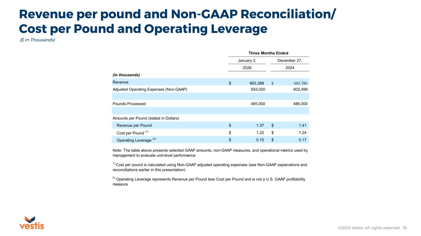 Non-GAAP Reconciliations / Adjusted Operating Expenses ©2025 Vestis. All rights reserved. 17 ($ in Thousands) 1) Please refer to Note 2. Transformation, Restructuring and Severance, in the Company’s Form 10-Q for the quarter ended January 2, 2026. 2) Separation Related Charges include third-party expenses incurred in connection with the Company’s separation from Aramark on September 30, 2023, and the establishment of stand-alone public company operations. These costs primarily consist of rebranding initiatives, development of stand-alone technology infrastructure, and professional services. 3) Other includes certain costs or income items that are not individually material and do not relate to core business activities. January 2, December 27, 2026 2024 Operating Expenses $ 646,810 $ 653,381 Depreciation and Amortization (34,341) (36,936) Share-Based Compensation (2,343) (5,180) Severance (1) (5,452) (4,393) Transformation Costs (7,811) — Separation Related Charges (2) (1,364) (4,619) Legal Reserves and Settlements (2,413) (1,357) Gains, Losses and Other (3) (66) 1,603 Adjusted Operating Expenses $ 593,020 $ 602,499 Revenue $ 663,388 $ 683,780 Adjusted Operating Expenses Margin 89.4% 88.1% Three Months Ended