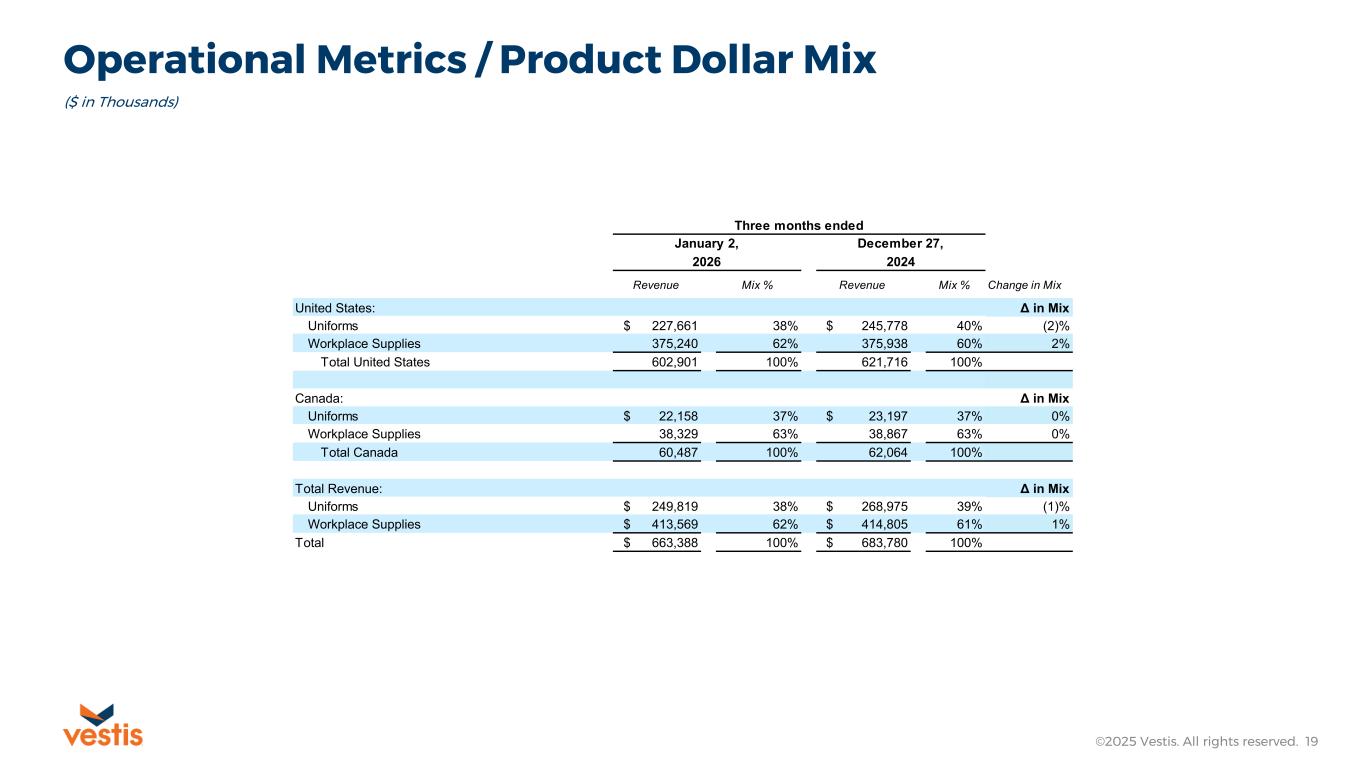 Revenue per pound and Non-GAAP Reconciliation/ Cost per Pound and Operating Leverage ©2025 Vestis. All rights reserved. 18 ($ in Thousands) January 2, December 27, 2026 2024 (In thousands) Revenue $ 663,388 $ 683,780 Adjusted Operating Expenses (Non-GAAP) 593,020 602,499 Pounds Processed 485,000 486,000 Amounts per Pound (stated in Dollars) Revenue per Pound $ 1.37 $ 1.41 Cost per Pound (1) $ 1.22 $ 1.24 Operating Leverage (2) $ 0.15 $ 0.17 Note: The table above presents selected GAAP amounts, non-GAAP measures, and operational metrics used by management to evaluate unit-level performance 1) Cost per pound is calculated using Non-GAAP adjusted operating expenses (see Non-GAAP explanations and reconciliations earlier in this presentation) 2) Operating Leverage represents Revenue per Pound less Cost per Pound and is not a U.S. GAAP profitability measure Three Months Ended