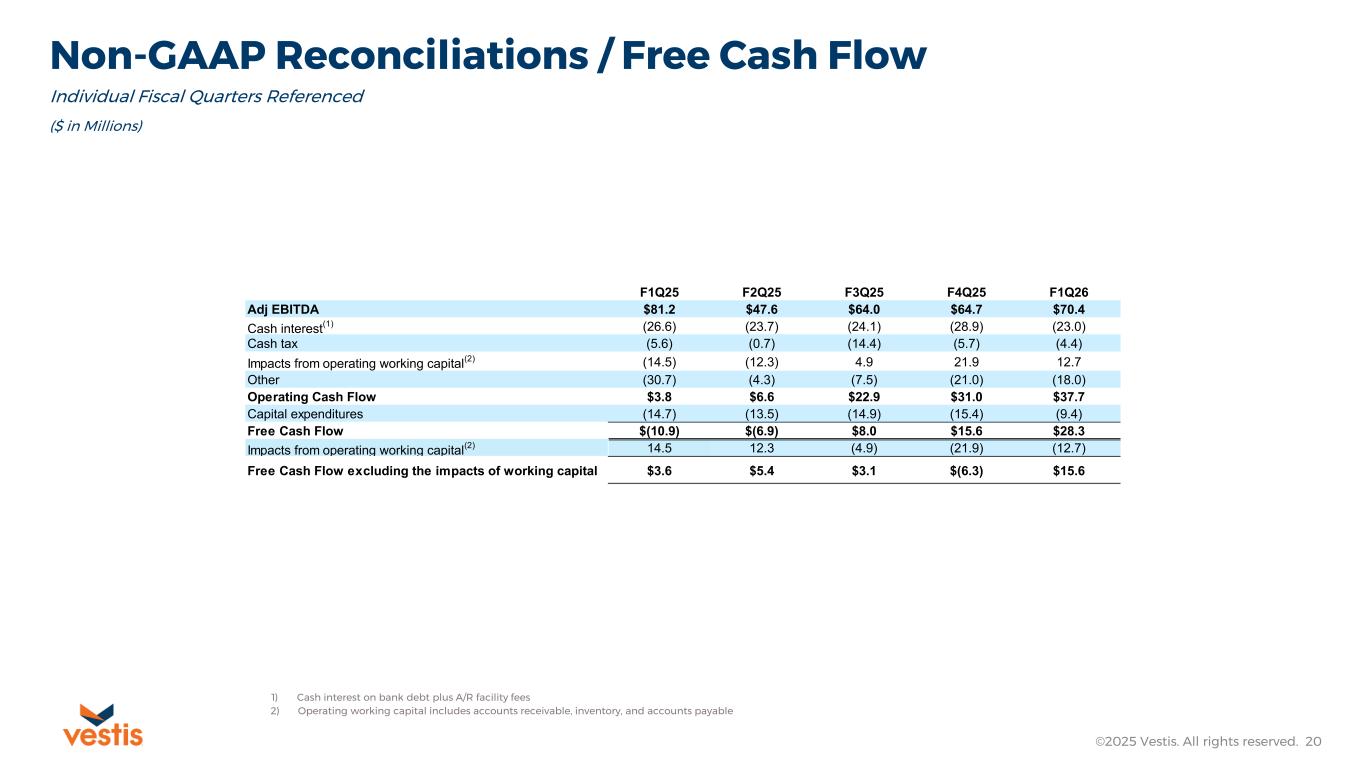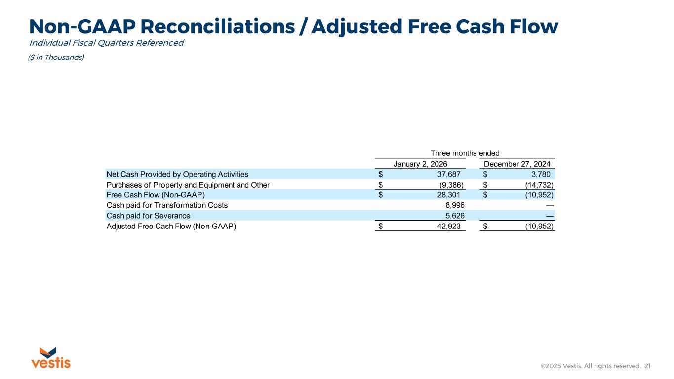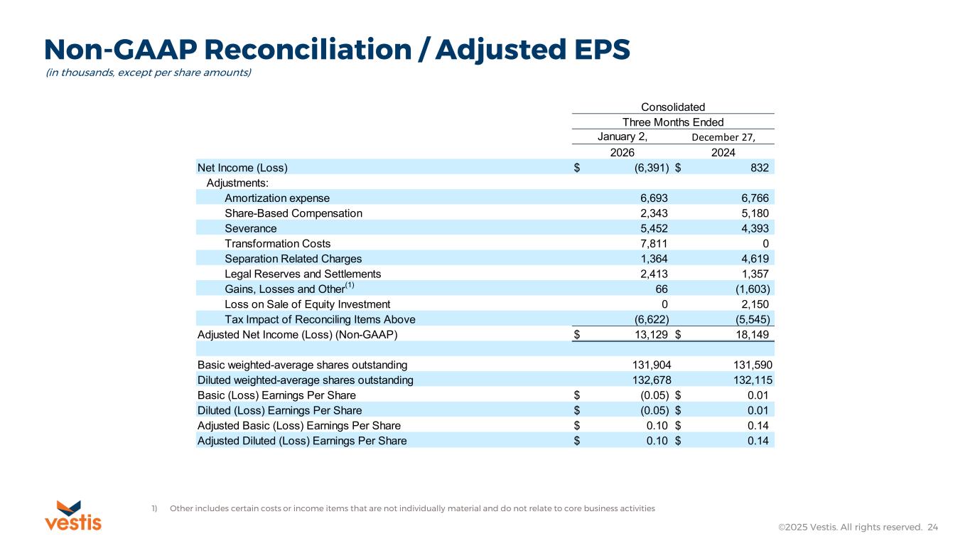 Non-GAAP Reconciliation / Adjusted EPS ©2025 Vestis. All rights reserved. 24 1) Other includes certain costs or income items that are not individually material and do not relate to core business activities (in thousands, except per share amounts) January 2, December 27, 2026 2024 Net Income (Loss) $ (6,391) $ 832 Adjustments: Amortization expense 6,693 6,766 Share-Based Compensation 2,343 5,180 Severance 5,452 4,393 Transformation Costs 7,811 0 Separation Related Charges 1,364 4,619 Legal Reserves and Settlements 2,413 1,357 Gains, Losses and Other (1) 66 (1,603) Loss on Sale of Equity Investment 0 2,150 Tax Impact of Reconciling Items Above (6,622) (5,545) Adjusted Net Income (Loss) (Non-GAAP) $ 13,129 $ 18,149 Basic weighted-average shares outstanding 131,904 131,590 Diluted weighted-average shares outstanding 132,678 132,115 Basic (Loss) Earnings Per Share $ (0.05) $ 0.01 Diluted (Loss) Earnings Per Share $ (0.05) $ 0.01 Adjusted Basic (Loss) Earnings Per Share $ 0.10 $ 0.14 Adjusted Diluted (Loss) Earnings Per Share $ 0.10 $ 0.14 Consolidated Three Months Ended