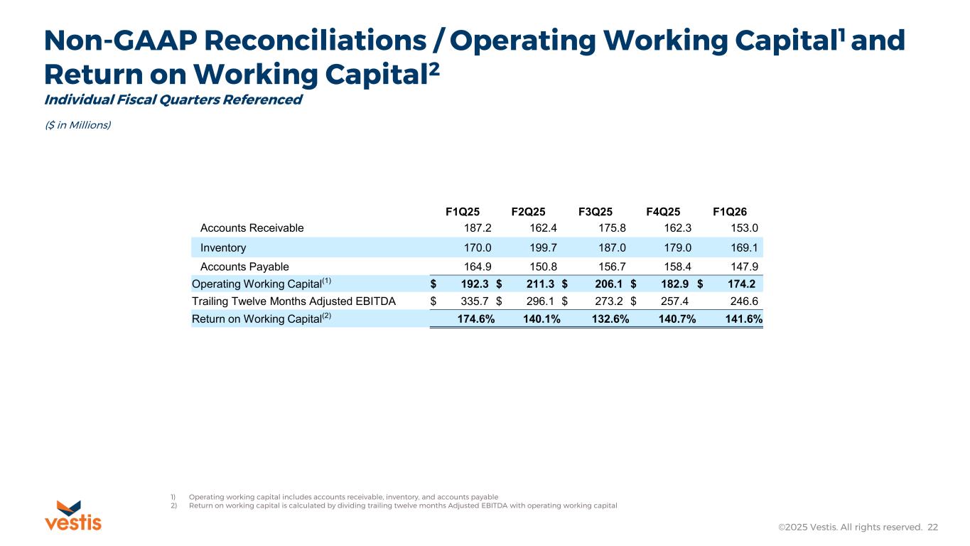 Non-GAAP Reconciliations / Adjusted Free Cash Flow ©2025 Vestis. All rights reserved. 21 ($ in Thousands) Individual Fiscal Quarters Referenced January 2, 2026 December 27, 2024 Net Cash Provided by Operating Activities $ 37,687 $ 3,780 Purchases of Property and Equipment and Other $ (9,386) $ (14,732) Free Cash Flow (Non-GAAP) $ 28,301 $ (10,952) Cash paid for Transformation Costs 8,996 — Cash paid for Severance 5,626 — Adjusted Free Cash Flow (Non-GAAP) $ 42,923 $ (10,952) Three months ended