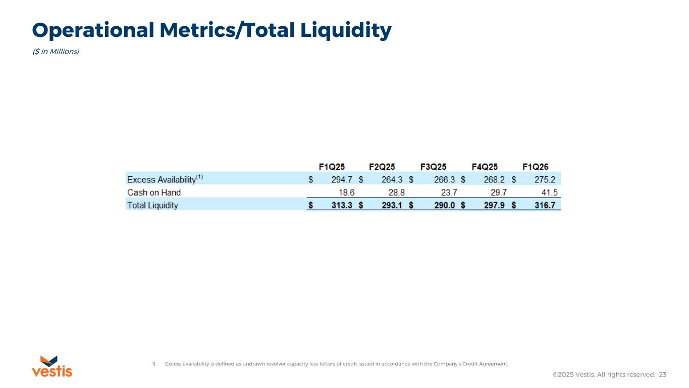 Operational Metrics/Total Liquidity ©2025 Vestis. All rights reserved. 23 ($ in Millions) 1) Excess availability is defined as undrawn revolver capacity less letters of credit issued in accordance with the Company’s Credit Agreement.