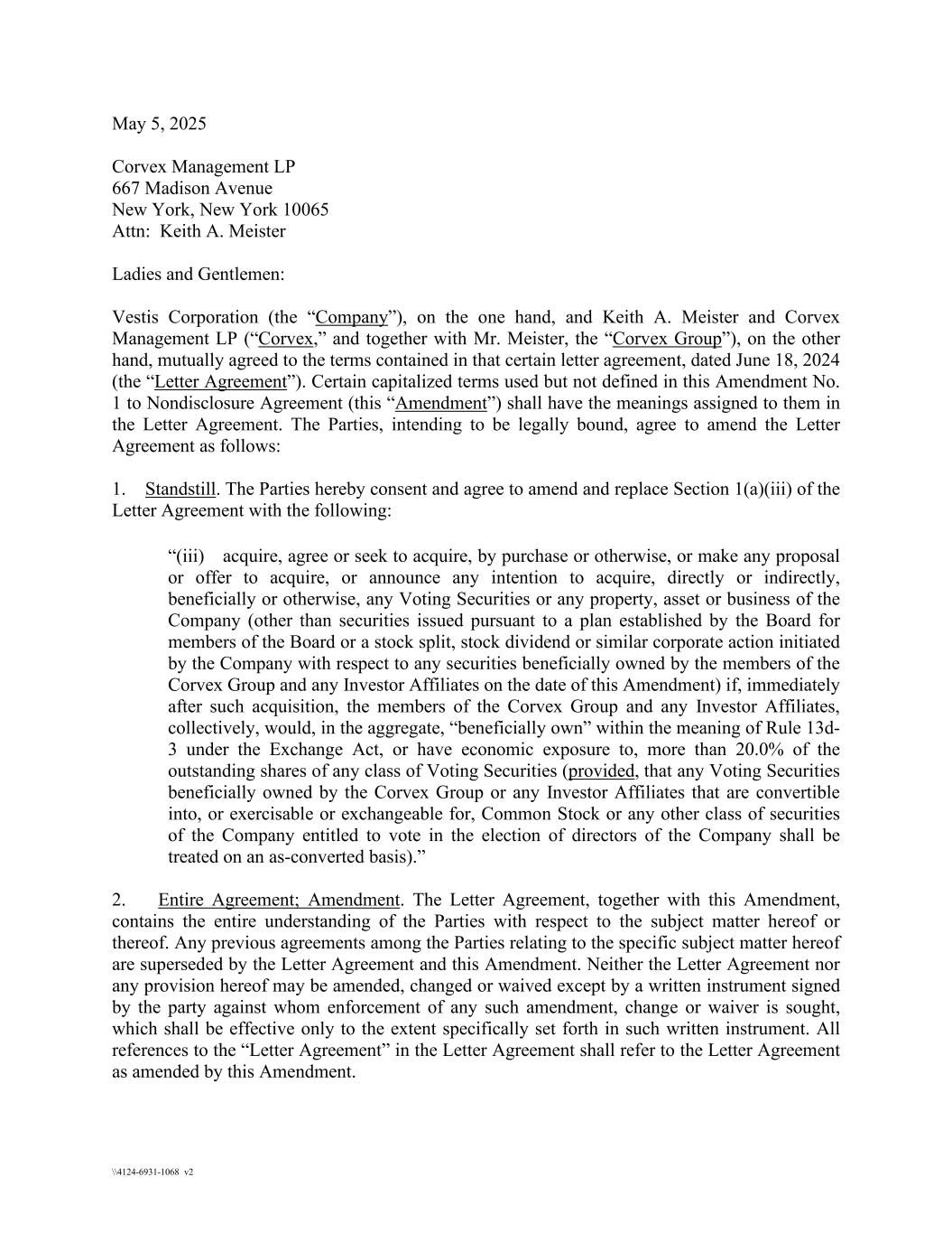\\4124-6931-1068 v2 May 5, 2025 Corvex Management LP 667 Madison Avenue New York, New York 10065 Attn: Keith A. Meister Ladies and Gentlemen: Vestis Corporation (the “Company”), on the one hand, and Keith A. Meister and Corvex Management LP (“Corvex,” and together with Mr. Meister, the “Corvex Group”), on the other hand, mutually agreed to the terms contained in that certain letter agreement, dated June 18, 2024 (the “Letter Agreement”). Certain capitalized terms used but not defined in this Amendment No. 1 to Nondisclosure Agreement (this “Amendment”) shall have the meanings assigned to them in the Letter Agreement. The Parties, intending to be legally bound, agree to amend the Letter Agreement as follows: 1. Standstill. The Parties hereby consent and agree to amend and replace Section 1(a)(iii) of the Letter Agreement with the following: “(iii) acquire, agree or seek to acquire, by purchase or otherwise, or make any proposal or offer to acquire, or announce any intention to acquire, directly or indirectly, beneficially or otherwise, any Voting Securities or any property, asset or business of the Company (other than securities issued pursuant to a plan established by the Board for members of the Board or a stock split, stock dividend or similar corporate action initiated by the Company with respect to any securities beneficially owned by the members of the Corvex Group and any Investor Affiliates on the date of this Amendment) if, immediately after such acquisition, the members of the Corvex Group and any Investor Affiliates, collectively, would, in the aggregate, “beneficially own” within the meaning of Rule 13d- 3 under the Exchange Act, or have economic exposure to, more than 20.0% of the outstanding shares of any class of Voting Securities (provided, that any Voting Securities beneficially owned by the Corvex Group or any Investor Affiliates that are convertible into, or exercisable or exchangeable for, Common Stock or any other class of securities of the Company entitled to vote in the election of directors of the Company shall be treated on an as-converted basis).” 2. Entire Agreement; Amendment. The Letter Agreement, together with this Amendment, contains the entire understanding of the Parties with respect to the subject matter hereof or thereof. Any previous agreements among the Parties relating to the specific subject matter hereof are superseded by the Letter Agreement and this Amendment. Neither the Letter Agreement nor any provision hereof may be amended, changed or waived except by a written instrument signed by the party against whom enforcement of any such amendment, change or waiver is sought, which shall be effective only to the extent specifically set forth in such written instrument. All references to the “Letter Agreement” in the Letter Agreement shall refer to the Letter Agreement as amended by this Amendment.