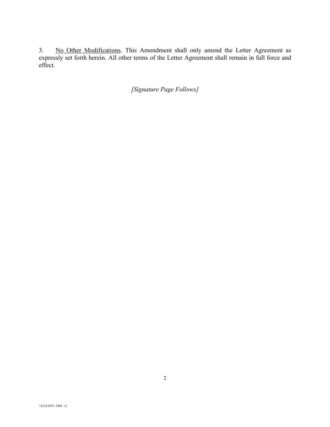 2 \\4124-6931-1068 v2 3. No Other Modifications. This Amendment shall only amend the Letter Agreement as expressly set forth herein. All other terms of the Letter Agreement shall remain in full force and effect. [Signature Page Follows]