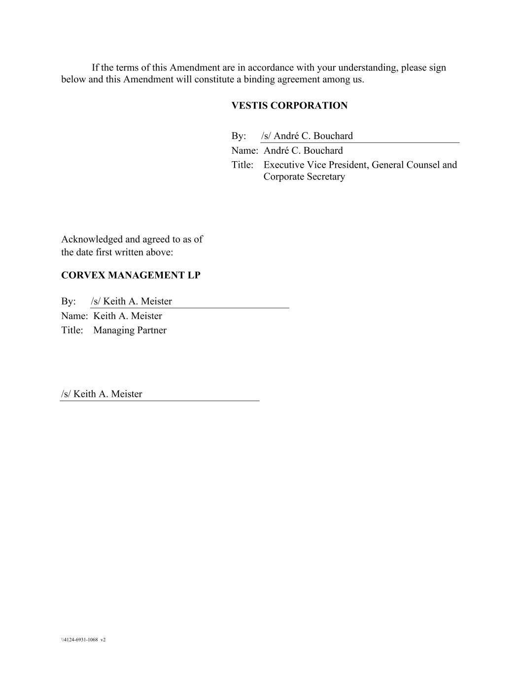 \\4124-6931-1068 v2 If the terms of this Amendment are in accordance with your understanding, please sign below and this Amendment will constitute a binding agreement among us. VESTIS CORPORATION By: /s/ André C. Bouchard Name: André C. Bouchard Title: Executive Vice President, General Counsel and Corporate Secretary Acknowledged and agreed to as of the date first written above: CORVEX MANAGEMENT LP By: /s/ Keith A. Meister Name: Keith A. Meister Title: Managing Partner /s/ Keith A. Meister