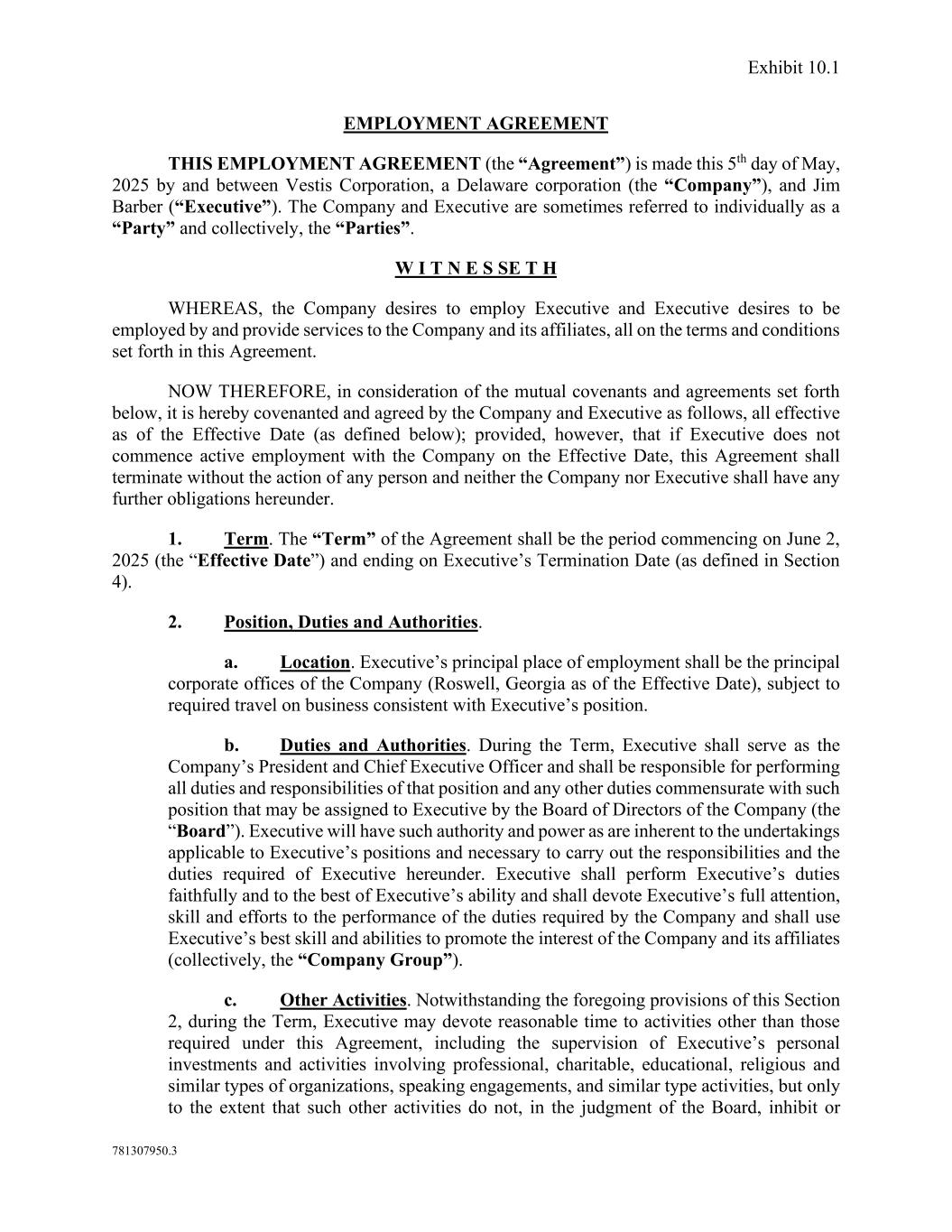 Exhibit 10.1 781307950.3 EMPLOYMENT AGREEMENT THIS EMPLOYMENT AGREEMENT (the “Agreement”) is made this 5th day of May, 2025 by and between Vestis Corporation, a Delaware corporation (the “Company”), and Jim Barber (“Executive”). The Company and Executive are sometimes referred to individually as a “Party” and collectively, the “Parties”. W I T N E S SE T H WHEREAS, the Company desires to employ Executive and Executive desires to be employed by and provide services to the Company and its affiliates, all on the terms and conditions set forth in this Agreement. NOW THEREFORE, in consideration of the mutual covenants and agreements set forth below, it is hereby covenanted and agreed by the Company and Executive as follows, all effective as of the Effective Date (as defined below); provided, however, that if Executive does not commence active employment with the Company on the Effective Date, this Agreement shall terminate without the action of any person and neither the Company nor Executive shall have any further obligations hereunder. 1. Term. The “Term” of the Agreement shall be the period commencing on June 2, 2025 (the “Effective Date”) and ending on Executive’s Termination Date (as defined in Section 4). 2. Position, Duties and Authorities. a. Location. Executive’s principal place of employment shall be the principal corporate offices of the Company (Roswell, Georgia as of the Effective Date), subject to required travel on business consistent with Executive’s position. b. Duties and Authorities. During the Term, Executive shall serve as the Company’s President and Chief Executive Officer and shall be responsible for performing all duties and responsibilities of that position and any other duties commensurate with such position that may be assigned to Executive by the Board of Directors of the Company (the “Board”). Executive will have such authority and power as are inherent to the undertakings applicable to Executive’s positions and necessary to carry out the responsibilities and the duties required of Executive hereunder. Executive shall perform Executive’s duties faithfully and to the best of Executive’s ability and shall devote Executive’s full attention, skill and efforts to the performance of the duties required by the Company and shall use Executive’s best skill and abilities to promote the interest of the Company and its affiliates (collectively, the “Company Group”). c. Other Activities. Notwithstanding the foregoing provisions of this Section 2, during the Term, Executive may devote reasonable time to activities other than those required under this Agreement, including the supervision of Executive’s personal investments and activities involving professional, charitable, educational, religious and similar types of organizations, speaking engagements, and similar type activities, but only to the extent that such other activities do not, in the judgment of the Board, inhibit or