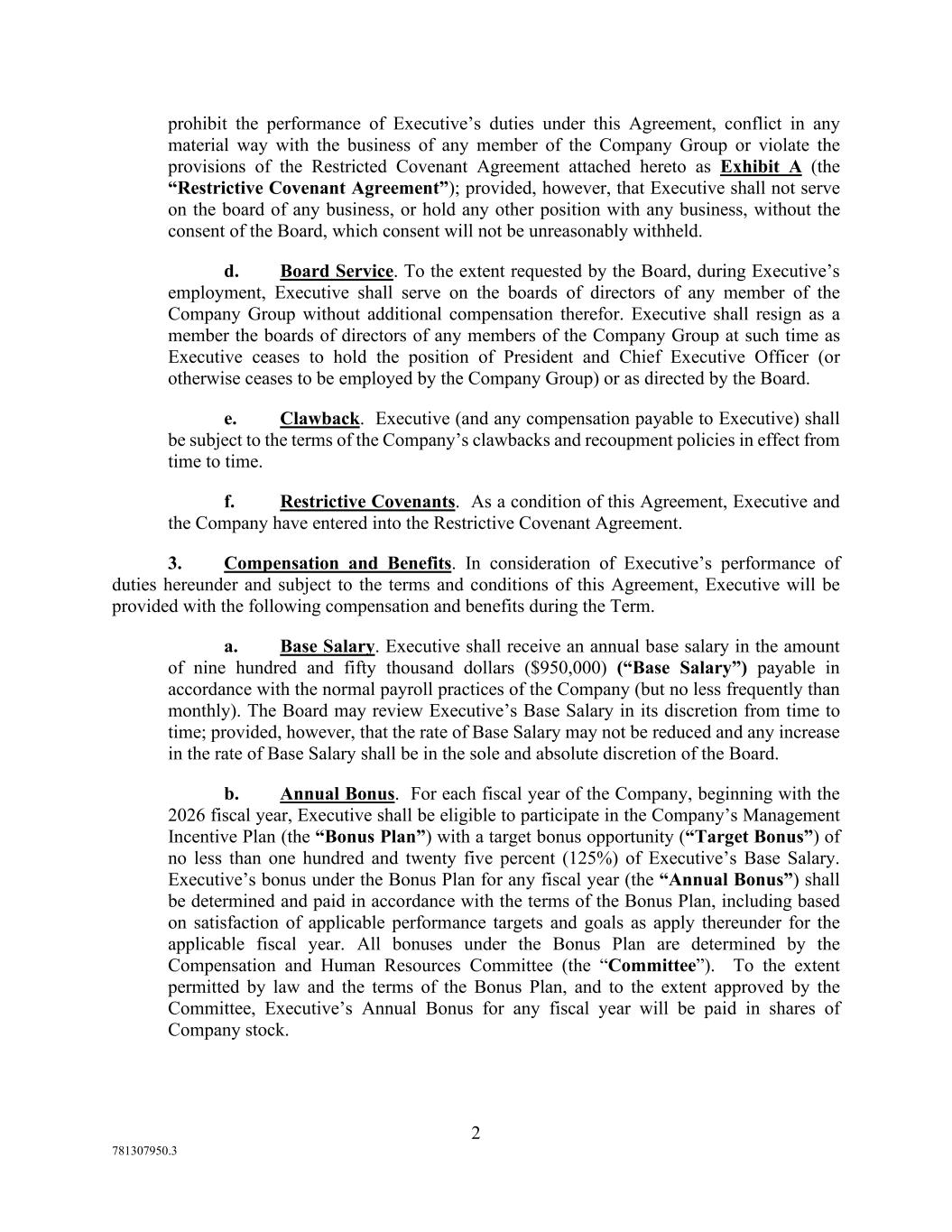 2 781307950.3 prohibit the performance of Executive’s duties under this Agreement, conflict in any material way with the business of any member of the Company Group or violate the provisions of the Restricted Covenant Agreement attached hereto as Exhibit A (the “Restrictive Covenant Agreement”); provided, however, that Executive shall not serve on the board of any business, or hold any other position with any business, without the consent of the Board, which consent will not be unreasonably withheld. d. Board Service. To the extent requested by the Board, during Executive’s employment, Executive shall serve on the boards of directors of any member of the Company Group without additional compensation therefor. Executive shall resign as a member the boards of directors of any members of the Company Group at such time as Executive ceases to hold the position of President and Chief Executive Officer (or otherwise ceases to be employed by the Company Group) or as directed by the Board. e. Clawback. Executive (and any compensation payable to Executive) shall be subject to the terms of the Company’s clawbacks and recoupment policies in effect from time to time. f. Restrictive Covenants. As a condition of this Agreement, Executive and the Company have entered into the Restrictive Covenant Agreement. 3. Compensation and Benefits. In consideration of Executive’s performance of duties hereunder and subject to the terms and conditions of this Agreement, Executive will be provided with the following compensation and benefits during the Term. a. Base Salary. Executive shall receive an annual base salary in the amount of nine hundred and fifty thousand dollars ($950,000) (“Base Salary”) payable in accordance with the normal payroll practices of the Company (but no less frequently than monthly). The Board may review Executive’s Base Salary in its discretion from time to time; provided, however, that the rate of Base Salary may not be reduced and any increase in the rate of Base Salary shall be in the sole and absolute discretion of the Board. b. Annual Bonus. For each fiscal year of the Company, beginning with the 2026 fiscal year, Executive shall be eligible to participate in the Company’s Management Incentive Plan (the “Bonus Plan”) with a target bonus opportunity (“Target Bonus”) of no less than one hundred and twenty five percent (125%) of Executive’s Base Salary. Executive’s bonus under the Bonus Plan for any fiscal year (the “Annual Bonus”) shall be determined and paid in accordance with the terms of the Bonus Plan, including based on satisfaction of applicable performance targets and goals as apply thereunder for the applicable fiscal year. All bonuses under the Bonus Plan are determined by the Compensation and Human Resources Committee (the “Committee”). To the extent permitted by law and the terms of the Bonus Plan, and to the extent approved by the Committee, Executive’s Annual Bonus for any fiscal year will be paid in shares of Company stock.