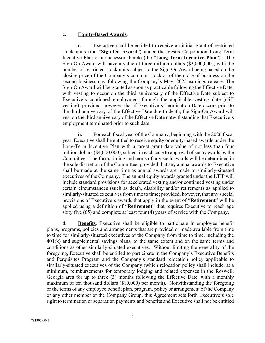 3 781307950.3 c. Equity-Based Awards. i. Executive shall be entitled to receive an initial grant of restricted stock units (the “Sign-On Award”) under the Vestis Corporation Long-Term Incentive Plan or a successor thereto (the “Long-Term Incentive Plan”). The Sign-On Award will have a value of three million dollars ($3,000,000), with the number of restricted stock units subject to the Sign-On Award being based on the closing price of the Company’s common stock as of the close of business on the second business day following the Company’s May, 2025 earnings release. The Sign-On Award will be granted as soon as practicable following the Effective Date, with vesting to occur on the third anniversary of the Effective Date subject to Executive’s continued employment through the applicable vesting date (cliff vesting); provided, however, that if Executive’s Termination Date occurs prior to the third anniversary of the Effective Date due to death, the Sign-On Award will vest on the third anniversary of the Effective Date notwithstanding that Executive’s employment terminated prior to such date. ii. For each fiscal year of the Company, beginning with the 2026 fiscal year, Executive shall be entitled to receive equity or equity-based awards under the Long-Term Incentive Plan with a target grant date value of not less than four million dollars ($4,000,000), subject in each case to approval of such awards by the Committee. The form, timing and terms of any such awards will be determined in the sole discretion of the Committee; provided that any annual awards to Executive shall be made at the same time as annual awards are made to similarly-situated executives of the Company. The annual equity awards granted under the LTIP will include standard provisions for accelerated vesting and/or continued vesting under certain circumstances (such as death, disability and/or retirement) as applied to similarly-situated executives from time to time; provided, however, that any special provisions of Executive’s awards that apply in the event of “Retirement” will be applied using a definition of “Retirement” that requires Executive to reach age sixty five (65) and complete at least four (4) years of service with the Company. d. Benefits. Executive shall be eligible to participate in employee benefit plans, programs, policies and arrangements that are provided or made available from time to time for similarly-situated executives of the Company from time to time, including the 401(k) and supplemental savings plans, to the same extent and on the same terms and conditions as other similarly-situated executives. Without limiting the generality of the foregoing, Executive shall be entitled to participate in the Company’s Executive Benefits and Perquisites Program and the Company’s standard relocation policy applicable to similarly-situated executives of the Company (which relocation policy shall include, at a minimum, reimbursements for temporary lodging and related expenses in the Roswell, Georgia area for up to three (3) months following the Effective Date, with a monthly maximum of ten thousand dollars ($10,000) per month). Notwithstanding the foregoing or the terms of any employee benefit plan, program, policy or arrangement of the Company or any other member of the Company Group, this Agreement sets forth Executive’s sole right to termination or separation payments and benefits and Executive shall not be entitled