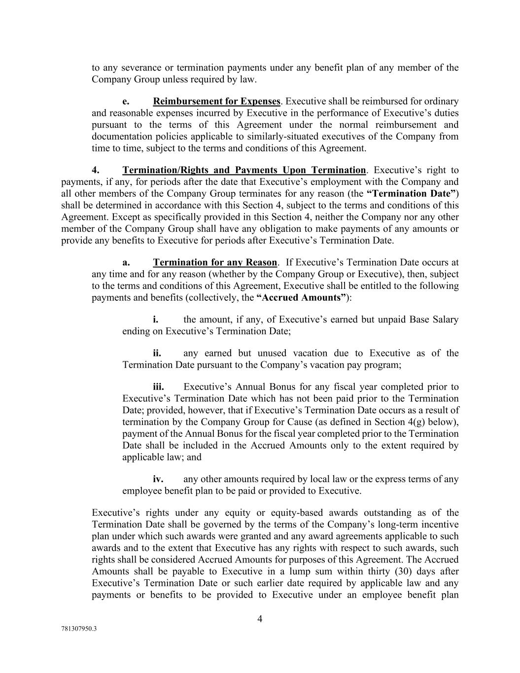 4 781307950.3 to any severance or termination payments under any benefit plan of any member of the Company Group unless required by law. e. Reimbursement for Expenses. Executive shall be reimbursed for ordinary and reasonable expenses incurred by Executive in the performance of Executive’s duties pursuant to the terms of this Agreement under the normal reimbursement and documentation policies applicable to similarly-situated executives of the Company from time to time, subject to the terms and conditions of this Agreement. 4. Termination/Rights and Payments Upon Termination. Executive’s right to payments, if any, for periods after the date that Executive’s employment with the Company and all other members of the Company Group terminates for any reason (the “Termination Date”) shall be determined in accordance with this Section 4, subject to the terms and conditions of this Agreement. Except as specifically provided in this Section 4, neither the Company nor any other member of the Company Group shall have any obligation to make payments of any amounts or provide any benefits to Executive for periods after Executive’s Termination Date. a. Termination for any Reason. If Executive’s Termination Date occurs at any time and for any reason (whether by the Company Group or Executive), then, subject to the terms and conditions of this Agreement, Executive shall be entitled to the following payments and benefits (collectively, the “Accrued Amounts”): i. the amount, if any, of Executive’s earned but unpaid Base Salary ending on Executive’s Termination Date; ii. any earned but unused vacation due to Executive as of the Termination Date pursuant to the Company’s vacation pay program; iii. Executive’s Annual Bonus for any fiscal year completed prior to Executive’s Termination Date which has not been paid prior to the Termination Date; provided, however, that if Executive’s Termination Date occurs as a result of termination by the Company Group for Cause (as defined in Section 4(g) below), payment of the Annual Bonus for the fiscal year completed prior to the Termination Date shall be included in the Accrued Amounts only to the extent required by applicable law; and iv. any other amounts required by local law or the express terms of any employee benefit plan to be paid or provided to Executive. Executive’s rights under any equity or equity-based awards outstanding as of the Termination Date shall be governed by the terms of the Company’s long-term incentive plan under which such awards were granted and any award agreements applicable to such awards and to the extent that Executive has any rights with respect to such awards, such rights shall be considered Accrued Amounts for purposes of this Agreement. The Accrued Amounts shall be payable to Executive in a lump sum within thirty (30) days after Executive’s Termination Date or such earlier date required by applicable law and any payments or benefits to be provided to Executive under an employee benefit plan