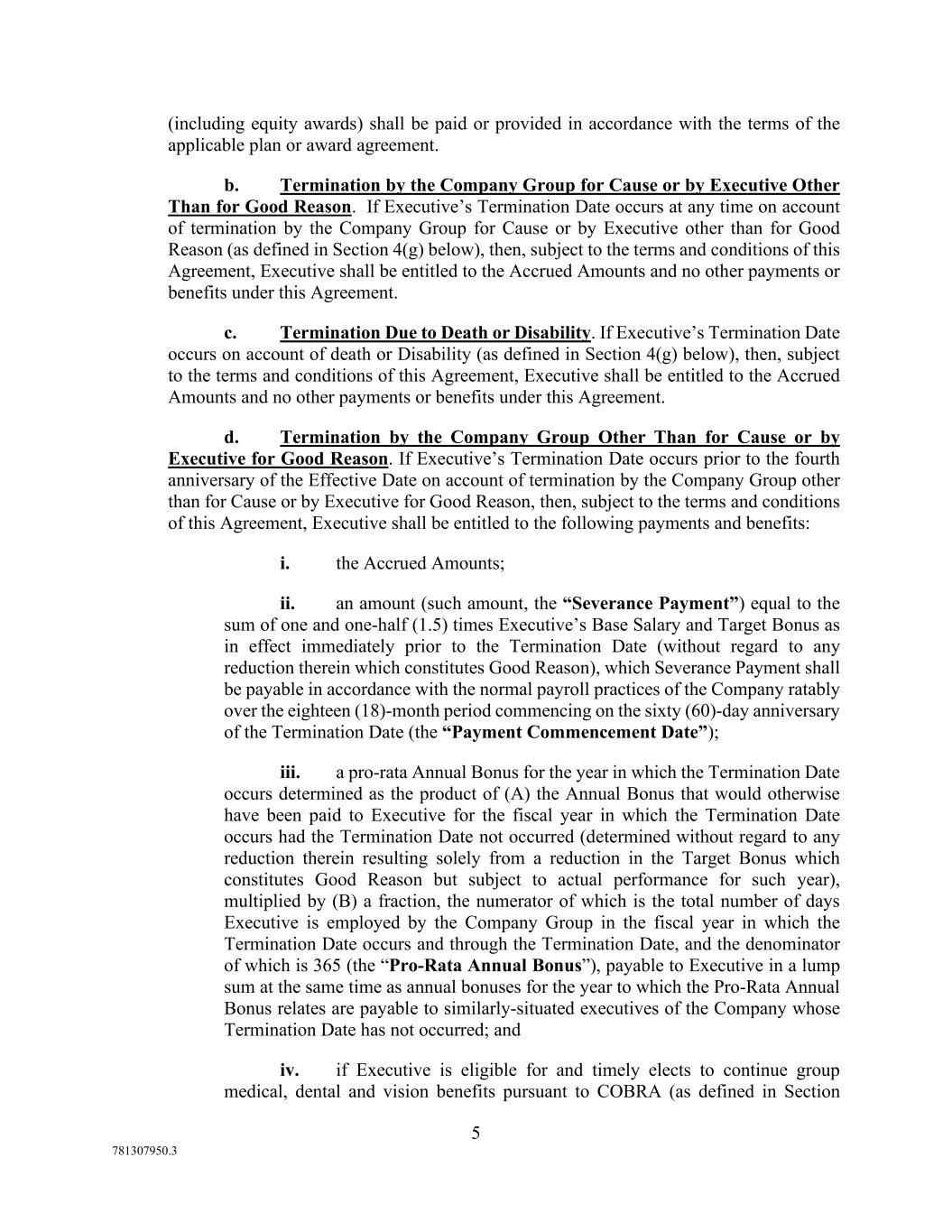 5 781307950.3 (including equity awards) shall be paid or provided in accordance with the terms of the applicable plan or award agreement. b. Termination by the Company Group for Cause or by Executive Other Than for Good Reason. If Executive’s Termination Date occurs at any time on account of termination by the Company Group for Cause or by Executive other than for Good Reason (as defined in Section 4(g) below), then, subject to the terms and conditions of this Agreement, Executive shall be entitled to the Accrued Amounts and no other payments or benefits under this Agreement. c. Termination Due to Death or Disability. If Executive’s Termination Date occurs on account of death or Disability (as defined in Section 4(g) below), then, subject to the terms and conditions of this Agreement, Executive shall be entitled to the Accrued Amounts and no other payments or benefits under this Agreement. d. Termination by the Company Group Other Than for Cause or by Executive for Good Reason. If Executive’s Termination Date occurs prior to the fourth anniversary of the Effective Date on account of termination by the Company Group other than for Cause or by Executive for Good Reason, then, subject to the terms and conditions of this Agreement, Executive shall be entitled to the following payments and benefits: i. the Accrued Amounts; ii. an amount (such amount, the “Severance Payment”) equal to the sum of one and one-half (1.5) times Executive’s Base Salary and Target Bonus as in effect immediately prior to the Termination Date (without regard to any reduction therein which constitutes Good Reason), which Severance Payment shall be payable in accordance with the normal payroll practices of the Company ratably over the eighteen (18)-month period commencing on the sixty (60)-day anniversary of the Termination Date (the “Payment Commencement Date”); iii. a pro-rata Annual Bonus for the year in which the Termination Date occurs determined as the product of (A) the Annual Bonus that would otherwise have been paid to Executive for the fiscal year in which the Termination Date occurs had the Termination Date not occurred (determined without regard to any reduction therein resulting solely from a reduction in the Target Bonus which constitutes Good Reason but subject to actual performance for such year), multiplied by (B) a fraction, the numerator of which is the total number of days Executive is employed by the Company Group in the fiscal year in which the Termination Date occurs and through the Termination Date, and the denominator of which is 365 (the “Pro-Rata Annual Bonus”), payable to Executive in a lump sum at the same time as annual bonuses for the year to which the Pro-Rata Annual Bonus relates are payable to similarly-situated executives of the Company whose Termination Date has not occurred; and iv. if Executive is eligible for and timely elects to continue group medical, dental and vision benefits pursuant to COBRA (as defined in Section