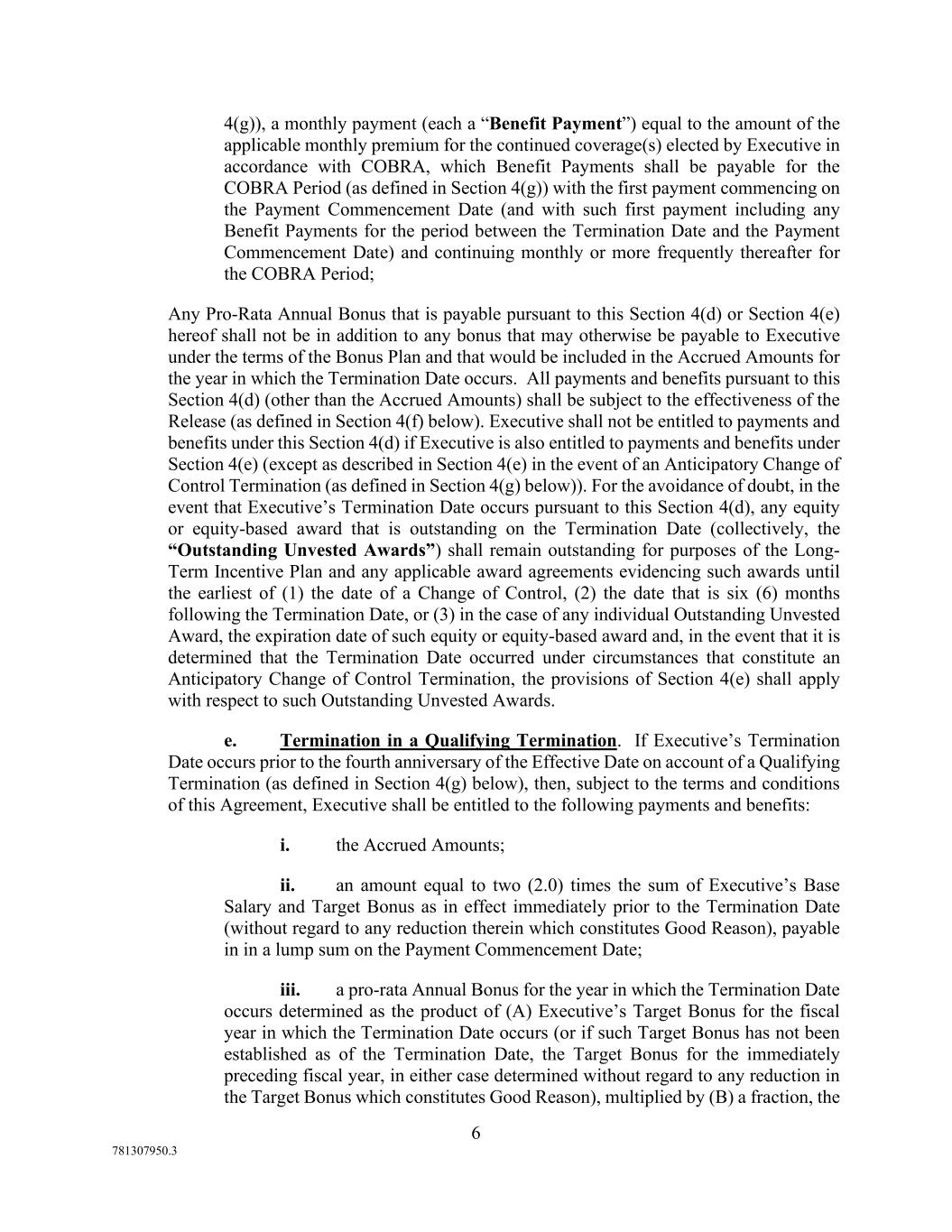 6 781307950.3 4(g)), a monthly payment (each a “Benefit Payment”) equal to the amount of the applicable monthly premium for the continued coverage(s) elected by Executive in accordance with COBRA, which Benefit Payments shall be payable for the COBRA Period (as defined in Section 4(g)) with the first payment commencing on the Payment Commencement Date (and with such first payment including any Benefit Payments for the period between the Termination Date and the Payment Commencement Date) and continuing monthly or more frequently thereafter for the COBRA Period; Any Pro-Rata Annual Bonus that is payable pursuant to this Section 4(d) or Section 4(e) hereof shall not be in addition to any bonus that may otherwise be payable to Executive under the terms of the Bonus Plan and that would be included in the Accrued Amounts for the year in which the Termination Date occurs. All payments and benefits pursuant to this Section 4(d) (other than the Accrued Amounts) shall be subject to the effectiveness of the Release (as defined in Section 4(f) below). Executive shall not be entitled to payments and benefits under this Section 4(d) if Executive is also entitled to payments and benefits under Section 4(e) (except as described in Section 4(e) in the event of an Anticipatory Change of Control Termination (as defined in Section 4(g) below)). For the avoidance of doubt, in the event that Executive’s Termination Date occurs pursuant to this Section 4(d), any equity or equity-based award that is outstanding on the Termination Date (collectively, the “Outstanding Unvested Awards”) shall remain outstanding for purposes of the Long- Term Incentive Plan and any applicable award agreements evidencing such awards until the earliest of (1) the date of a Change of Control, (2) the date that is six (6) months following the Termination Date, or (3) in the case of any individual Outstanding Unvested Award, the expiration date of such equity or equity-based award and, in the event that it is determined that the Termination Date occurred under circumstances that constitute an Anticipatory Change of Control Termination, the provisions of Section 4(e) shall apply with respect to such Outstanding Unvested Awards. e. Termination in a Qualifying Termination. If Executive’s Termination Date occurs prior to the fourth anniversary of the Effective Date on account of a Qualifying Termination (as defined in Section 4(g) below), then, subject to the terms and conditions of this Agreement, Executive shall be entitled to the following payments and benefits: i. the Accrued Amounts; ii. an amount equal to two (2.0) times the sum of Executive’s Base Salary and Target Bonus as in effect immediately prior to the Termination Date (without regard to any reduction therein which constitutes Good Reason), payable in in a lump sum on the Payment Commencement Date; iii. a pro-rata Annual Bonus for the year in which the Termination Date occurs determined as the product of (A) Executive’s Target Bonus for the fiscal year in which the Termination Date occurs (or if such Target Bonus has not been established as of the Termination Date, the Target Bonus for the immediately preceding fiscal year, in either case determined without regard to any reduction in the Target Bonus which constitutes Good Reason), multiplied by (B) a fraction, the