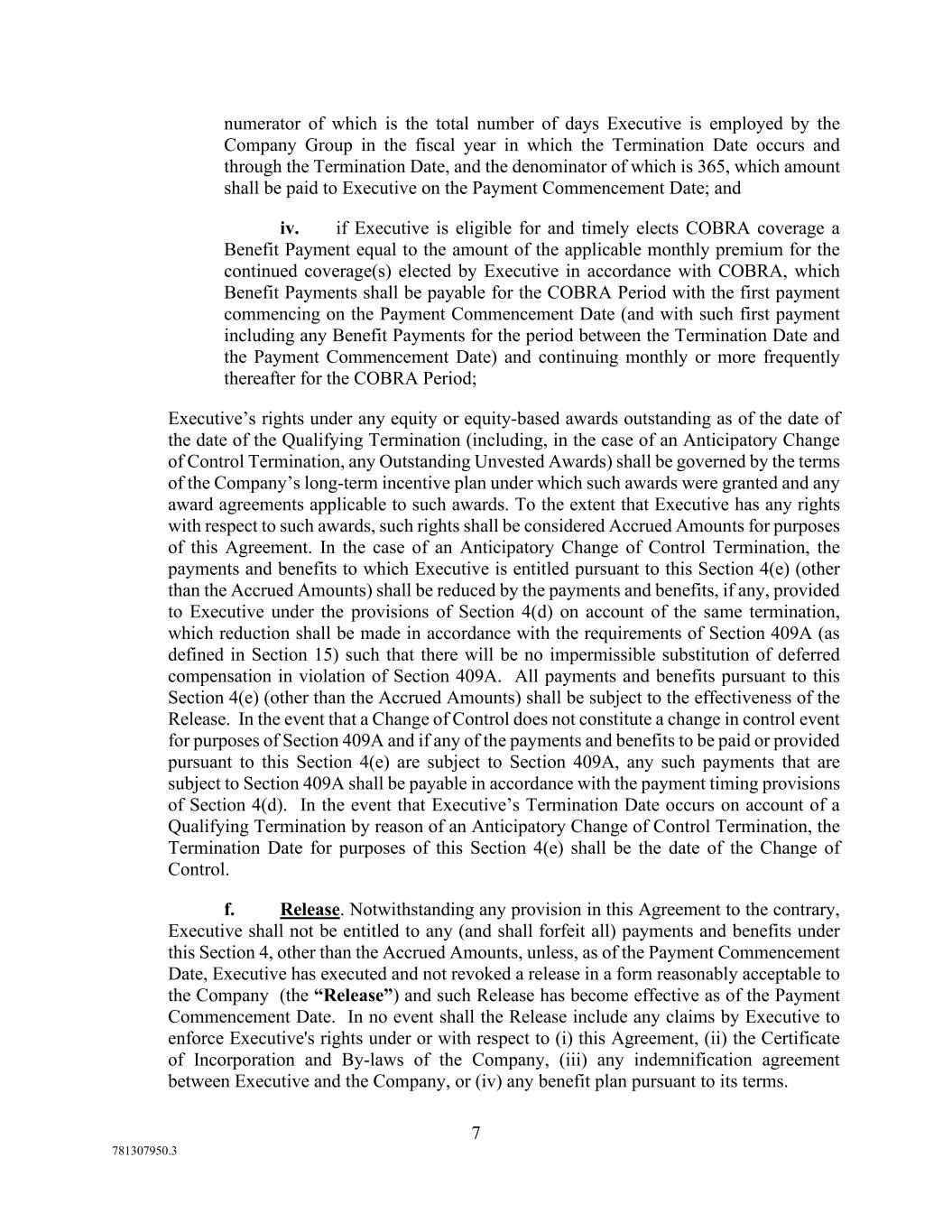 7 781307950.3 numerator of which is the total number of days Executive is employed by the Company Group in the fiscal year in which the Termination Date occurs and through the Termination Date, and the denominator of which is 365, which amount shall be paid to Executive on the Payment Commencement Date; and iv. if Executive is eligible for and timely elects COBRA coverage a Benefit Payment equal to the amount of the applicable monthly premium for the continued coverage(s) elected by Executive in accordance with COBRA, which Benefit Payments shall be payable for the COBRA Period with the first payment commencing on the Payment Commencement Date (and with such first payment including any Benefit Payments for the period between the Termination Date and the Payment Commencement Date) and continuing monthly or more frequently thereafter for the COBRA Period; Executive’s rights under any equity or equity-based awards outstanding as of the date of the date of the Qualifying Termination (including, in the case of an Anticipatory Change of Control Termination, any Outstanding Unvested Awards) shall be governed by the terms of the Company’s long-term incentive plan under which such awards were granted and any award agreements applicable to such awards. To the extent that Executive has any rights with respect to such awards, such rights shall be considered Accrued Amounts for purposes of this Agreement. In the case of an Anticipatory Change of Control Termination, the payments and benefits to which Executive is entitled pursuant to this Section 4(e) (other than the Accrued Amounts) shall be reduced by the payments and benefits, if any, provided to Executive under the provisions of Section 4(d) on account of the same termination, which reduction shall be made in accordance with the requirements of Section 409A (as defined in Section 15) such that there will be no impermissible substitution of deferred compensation in violation of Section 409A. All payments and benefits pursuant to this Section 4(e) (other than the Accrued Amounts) shall be subject to the effectiveness of the Release. In the event that a Change of Control does not constitute a change in control event for purposes of Section 409A and if any of the payments and benefits to be paid or provided pursuant to this Section 4(e) are subject to Section 409A, any such payments that are subject to Section 409A shall be payable in accordance with the payment timing provisions of Section 4(d). In the event that Executive’s Termination Date occurs on account of a Qualifying Termination by reason of an Anticipatory Change of Control Termination, the Termination Date for purposes of this Section 4(e) shall be the date of the Change of Control. f. Release. Notwithstanding any provision in this Agreement to the contrary, Executive shall not be entitled to any (and shall forfeit all) payments and benefits under this Section 4, other than the Accrued Amounts, unless, as of the Payment Commencement Date, Executive has executed and not revoked a release in a form reasonably acceptable to the Company (the “Release”) and such Release has become effective as of the Payment Commencement Date. In no event shall the Release include any claims by Executive to enforce Executive's rights under or with respect to (i) this Agreement, (ii) the Certificate of Incorporation and By-laws of the Company, (iii) any indemnification agreement between Executive and the Company, or (iv) any benefit plan pursuant to its terms.