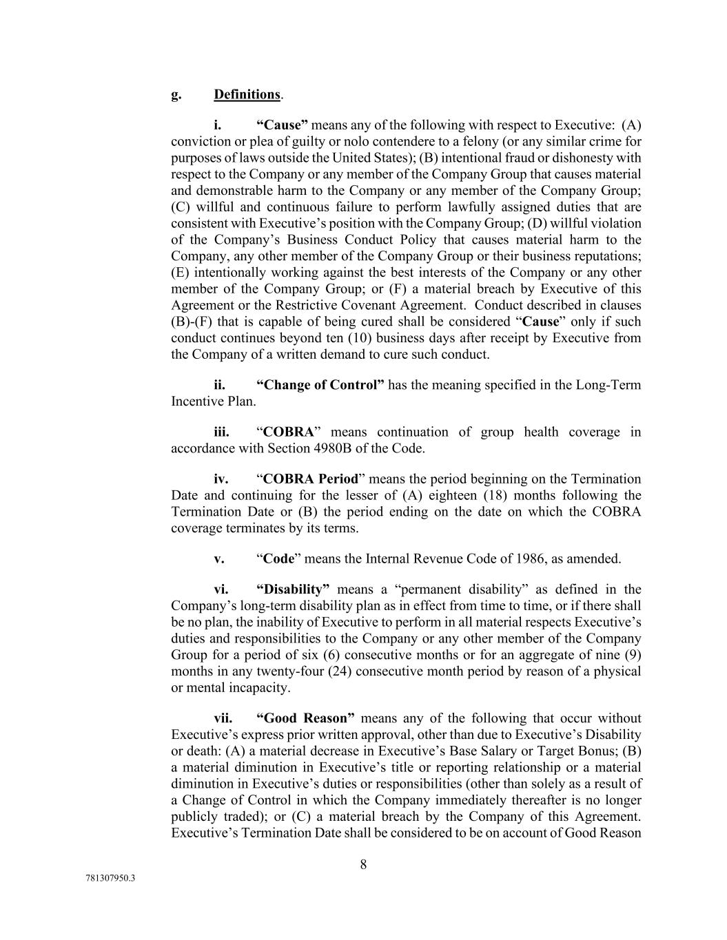 8 781307950.3 g. Definitions. i. “Cause” means any of the following with respect to Executive: (A) conviction or plea of guilty or nolo contendere to a felony (or any similar crime for purposes of laws outside the United States); (B) intentional fraud or dishonesty with respect to the Company or any member of the Company Group that causes material and demonstrable harm to the Company or any member of the Company Group; (C) willful and continuous failure to perform lawfully assigned duties that are consistent with Executive’s position with the Company Group; (D) willful violation of the Company’s Business Conduct Policy that causes material harm to the Company, any other member of the Company Group or their business reputations; (E) intentionally working against the best interests of the Company or any other member of the Company Group; or (F) a material breach by Executive of this Agreement or the Restrictive Covenant Agreement. Conduct described in clauses (B)-(F) that is capable of being cured shall be considered “Cause” only if such conduct continues beyond ten (10) business days after receipt by Executive from the Company of a written demand to cure such conduct. ii. “Change of Control” has the meaning specified in the Long-Term Incentive Plan. iii. “COBRA” means continuation of group health coverage in accordance with Section 4980B of the Code. iv. “COBRA Period” means the period beginning on the Termination Date and continuing for the lesser of (A) eighteen (18) months following the Termination Date or (B) the period ending on the date on which the COBRA coverage terminates by its terms. v. “Code” means the Internal Revenue Code of 1986, as amended. vi. “Disability” means a “permanent disability” as defined in the Company’s long-term disability plan as in effect from time to time, or if there shall be no plan, the inability of Executive to perform in all material respects Executive’s duties and responsibilities to the Company or any other member of the Company Group for a period of six (6) consecutive months or for an aggregate of nine (9) months in any twenty-four (24) consecutive month period by reason of a physical or mental incapacity. vii. “Good Reason” means any of the following that occur without Executive’s express prior written approval, other than due to Executive’s Disability or death: (A) a material decrease in Executive’s Base Salary or Target Bonus; (B) a material diminution in Executive’s title or reporting relationship or a material diminution in Executive’s duties or responsibilities (other than solely as a result of a Change of Control in which the Company immediately thereafter is no longer publicly traded); or (C) a material breach by the Company of this Agreement. Executive’s Termination Date shall be considered to be on account of Good Reason