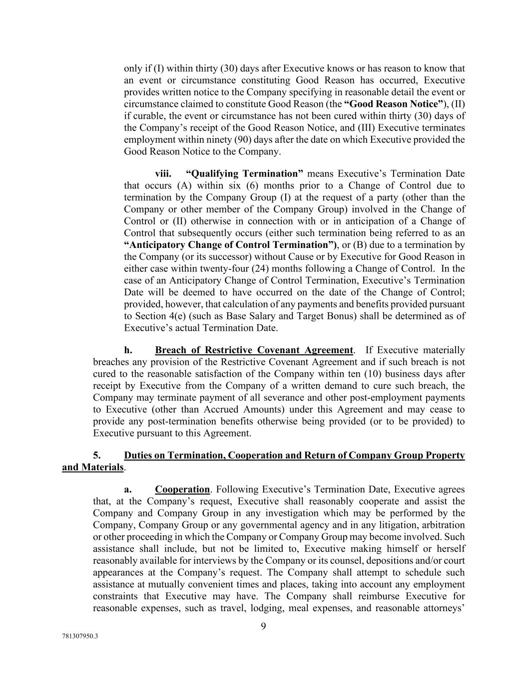 9 781307950.3 only if (I) within thirty (30) days after Executive knows or has reason to know that an event or circumstance constituting Good Reason has occurred, Executive provides written notice to the Company specifying in reasonable detail the event or circumstance claimed to constitute Good Reason (the “Good Reason Notice”), (II) if curable, the event or circumstance has not been cured within thirty (30) days of the Company’s receipt of the Good Reason Notice, and (III) Executive terminates employment within ninety (90) days after the date on which Executive provided the Good Reason Notice to the Company. viii. “Qualifying Termination” means Executive’s Termination Date that occurs (A) within six (6) months prior to a Change of Control due to termination by the Company Group (I) at the request of a party (other than the Company or other member of the Company Group) involved in the Change of Control or (II) otherwise in connection with or in anticipation of a Change of Control that subsequently occurs (either such termination being referred to as an “Anticipatory Change of Control Termination”), or (B) due to a termination by the Company (or its successor) without Cause or by Executive for Good Reason in either case within twenty-four (24) months following a Change of Control. In the case of an Anticipatory Change of Control Termination, Executive’s Termination Date will be deemed to have occurred on the date of the Change of Control; provided, however, that calculation of any payments and benefits provided pursuant to Section 4(e) (such as Base Salary and Target Bonus) shall be determined as of Executive’s actual Termination Date. h. Breach of Restrictive Covenant Agreement. If Executive materially breaches any provision of the Restrictive Covenant Agreement and if such breach is not cured to the reasonable satisfaction of the Company within ten (10) business days after receipt by Executive from the Company of a written demand to cure such breach, the Company may terminate payment of all severance and other post-employment payments to Executive (other than Accrued Amounts) under this Agreement and may cease to provide any post-termination benefits otherwise being provided (or to be provided) to Executive pursuant to this Agreement. 5. Duties on Termination, Cooperation and Return of Company Group Property and Materials. a. Cooperation. Following Executive’s Termination Date, Executive agrees that, at the Company’s request, Executive shall reasonably cooperate and assist the Company and Company Group in any investigation which may be performed by the Company, Company Group or any governmental agency and in any litigation, arbitration or other proceeding in which the Company or Company Group may become involved. Such assistance shall include, but not be limited to, Executive making himself or herself reasonably available for interviews by the Company or its counsel, depositions and/or court appearances at the Company’s request. The Company shall attempt to schedule such assistance at mutually convenient times and places, taking into account any employment constraints that Executive may have. The Company shall reimburse Executive for reasonable expenses, such as travel, lodging, meal expenses, and reasonable attorneys’