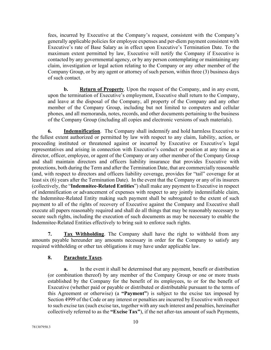 10 781307950.3 fees, incurred by Executive at the Company’s request, consistent with the Company’s generally applicable policies for employee expenses and per-diem payment consistent with Executive’s rate of Base Salary as in effect upon Executive’s Termination Date. To the maximum extent permitted by law, Executive will notify the Company if Executive is contacted by any governmental agency, or by any person contemplating or maintaining any claim, investigation or legal action relating to the Company or any other member of the Company Group, or by any agent or attorney of such person, within three (3) business days of such contact. b. Return of Property. Upon the request of the Company, and in any event, upon the termination of Executive’s employment, Executive shall return to the Company, and leave at the disposal of the Company, all property of the Company and any other member of the Company Group, including but not limited to computers and cellular phones, and all memoranda, notes, records, and other documents pertaining to the business of the Company Group (including all copies and electronic versions of such materials). 6. Indemnification. The Company shall indemnify and hold harmless Executive to the fullest extent authorized or permitted by law with respect to any claim, liability, action, or proceeding instituted or threatened against or incurred by Executive or Executive’s legal representatives and arising in connection with Executive’s conduct or position at any time as a director, officer, employee, or agent of the Company or any other member of the Company Group and shall maintain directors and officers liability insurance that provides Executive with protections, both during the Term and after the Termination Date, that are commercially reasonable (and, with respect to directors and officers liability coverage, provides for “tail” coverage for at least six (6) years after the Termination Date). In the event that the Company or any of its insurers (collectively, the “Indemnitee-Related Entities”) shall make any payment to Executive in respect of indemnification or advancement of expenses with respect to any jointly indemnifiable claim, the Indemnitee-Related Entity making such payment shall be subrogated to the extent of such payment to all of the rights of recovery of Executive against the Company and Executive shall execute all papers reasonably required and shall do all things that may be reasonably necessary to secure such rights, including the execution of such documents as may be necessary to enable the Indemnitee-Related Entities effectively to bring suit to enforce such rights. 7. Tax Withholding. The Company shall have the right to withhold from any amounts payable hereunder any amounts necessary in order for the Company to satisfy any required withholding or other tax obligations it may have under applicable law. 8. Parachute Taxes. a. In the event it shall be determined that any payment, benefit or distribution (or combination thereof) by any member of the Company Group or one or more trusts established by the Company for the benefit of its employees, to or for the benefit of Executive (whether paid or payable or distributed or distributable pursuant to the terms of this Agreement or otherwise) (a “Payment”) is subject to the excise tax imposed by Section 4999 of the Code or any interest or penalties are incurred by Executive with respect to such excise tax (such excise tax, together with any such interest and penalties, hereinafter collectively referred to as the “Excise Tax”), if the net after-tax amount of such Payments,