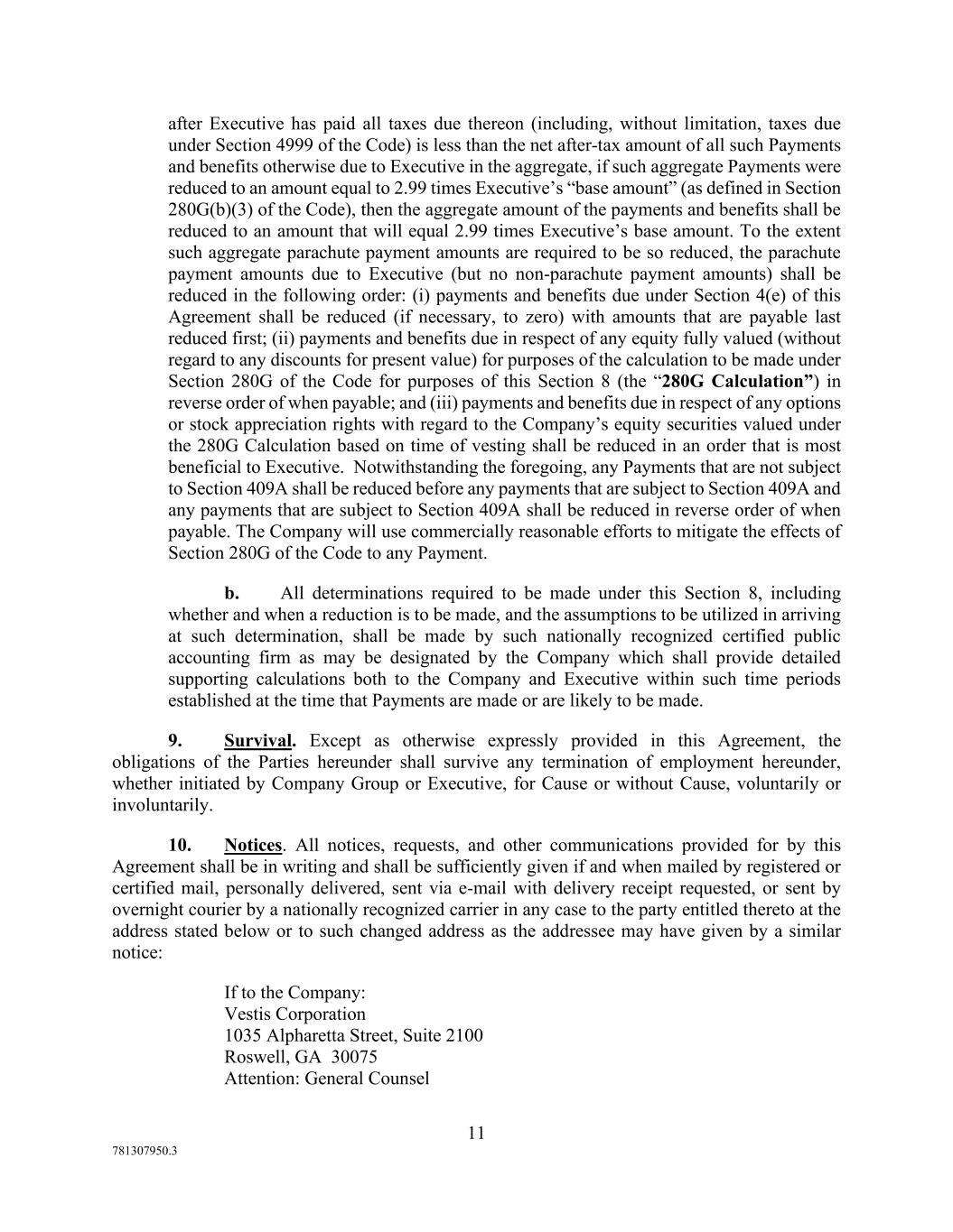 11 781307950.3 after Executive has paid all taxes due thereon (including, without limitation, taxes due under Section 4999 of the Code) is less than the net after-tax amount of all such Payments and benefits otherwise due to Executive in the aggregate, if such aggregate Payments were reduced to an amount equal to 2.99 times Executive’s “base amount” (as defined in Section 280G(b)(3) of the Code), then the aggregate amount of the payments and benefits shall be reduced to an amount that will equal 2.99 times Executive’s base amount. To the extent such aggregate parachute payment amounts are required to be so reduced, the parachute payment amounts due to Executive (but no non-parachute payment amounts) shall be reduced in the following order: (i) payments and benefits due under Section 4(e) of this Agreement shall be reduced (if necessary, to zero) with amounts that are payable last reduced first; (ii) payments and benefits due in respect of any equity fully valued (without regard to any discounts for present value) for purposes of the calculation to be made under Section 280G of the Code for purposes of this Section 8 (the “280G Calculation”) in reverse order of when payable; and (iii) payments and benefits due in respect of any options or stock appreciation rights with regard to the Company’s equity securities valued under the 280G Calculation based on time of vesting shall be reduced in an order that is most beneficial to Executive. Notwithstanding the foregoing, any Payments that are not subject to Section 409A shall be reduced before any payments that are subject to Section 409A and any payments that are subject to Section 409A shall be reduced in reverse order of when payable. The Company will use commercially reasonable efforts to mitigate the effects of Section 280G of the Code to any Payment. b. All determinations required to be made under this Section 8, including whether and when a reduction is to be made, and the assumptions to be utilized in arriving at such determination, shall be made by such nationally recognized certified public accounting firm as may be designated by the Company which shall provide detailed supporting calculations both to the Company and Executive within such time periods established at the time that Payments are made or are likely to be made. 9. Survival. Except as otherwise expressly provided in this Agreement, the obligations of the Parties hereunder shall survive any termination of employment hereunder, whether initiated by Company Group or Executive, for Cause or without Cause, voluntarily or involuntarily. 10. Notices. All notices, requests, and other communications provided for by this Agreement shall be in writing and shall be sufficiently given if and when mailed by registered or certified mail, personally delivered, sent via e-mail with delivery receipt requested, or sent by overnight courier by a nationally recognized carrier in any case to the party entitled thereto at the address stated below or to such changed address as the addressee may have given by a similar notice: If to the Company: Vestis Corporation 1035 Alpharetta Street, Suite 2100 Roswell, GA 30075 Attention: General Counsel