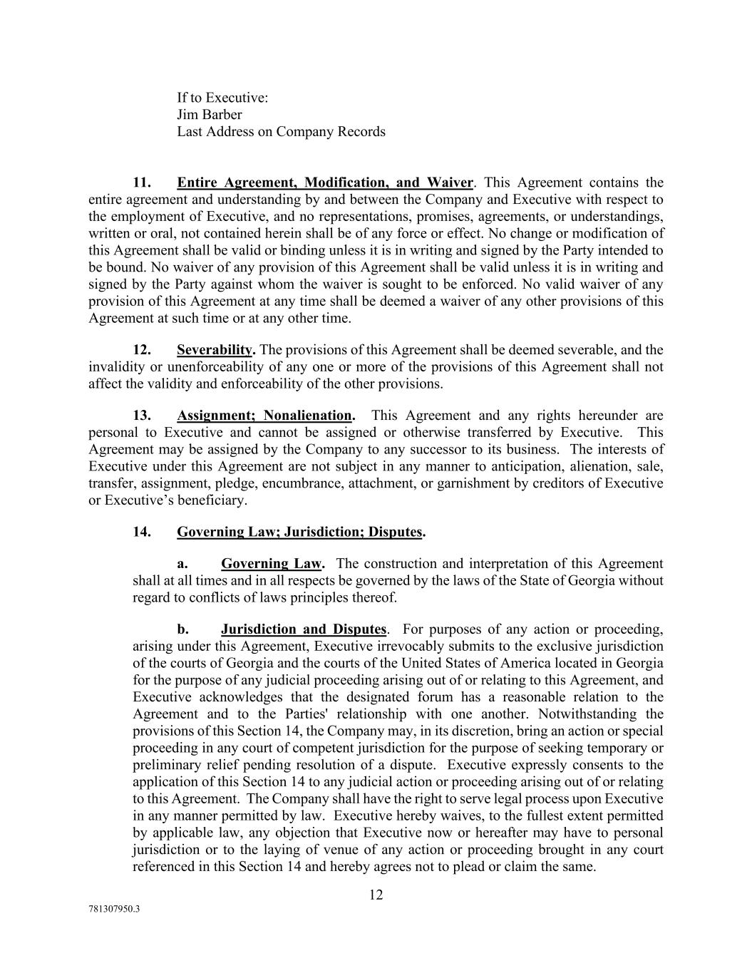 12 781307950.3 If to Executive: Jim Barber Last Address on Company Records 11. Entire Agreement, Modification, and Waiver. This Agreement contains the entire agreement and understanding by and between the Company and Executive with respect to the employment of Executive, and no representations, promises, agreements, or understandings, written or oral, not contained herein shall be of any force or effect. No change or modification of this Agreement shall be valid or binding unless it is in writing and signed by the Party intended to be bound. No waiver of any provision of this Agreement shall be valid unless it is in writing and signed by the Party against whom the waiver is sought to be enforced. No valid waiver of any provision of this Agreement at any time shall be deemed a waiver of any other provisions of this Agreement at such time or at any other time. 12. Severability. The provisions of this Agreement shall be deemed severable, and the invalidity or unenforceability of any one or more of the provisions of this Agreement shall not affect the validity and enforceability of the other provisions. 13. Assignment; Nonalienation. This Agreement and any rights hereunder are personal to Executive and cannot be assigned or otherwise transferred by Executive. This Agreement may be assigned by the Company to any successor to its business. The interests of Executive under this Agreement are not subject in any manner to anticipation, alienation, sale, transfer, assignment, pledge, encumbrance, attachment, or garnishment by creditors of Executive or Executive’s beneficiary. 14. Governing Law; Jurisdiction; Disputes. a. Governing Law. The construction and interpretation of this Agreement shall at all times and in all respects be governed by the laws of the State of Georgia without regard to conflicts of laws principles thereof. b. Jurisdiction and Disputes. For purposes of any action or proceeding, arising under this Agreement, Executive irrevocably submits to the exclusive jurisdiction of the courts of Georgia and the courts of the United States of America located in Georgia for the purpose of any judicial proceeding arising out of or relating to this Agreement, and Executive acknowledges that the designated forum has a reasonable relation to the Agreement and to the Parties' relationship with one another. Notwithstanding the provisions of this Section 14, the Company may, in its discretion, bring an action or special proceeding in any court of competent jurisdiction for the purpose of seeking temporary or preliminary relief pending resolution of a dispute. Executive expressly consents to the application of this Section 14 to any judicial action or proceeding arising out of or relating to this Agreement. The Company shall have the right to serve legal process upon Executive in any manner permitted by law. Executive hereby waives, to the fullest extent permitted by applicable law, any objection that Executive now or hereafter may have to personal jurisdiction or to the laying of venue of any action or proceeding brought in any court referenced in this Section 14 and hereby agrees not to plead or claim the same.