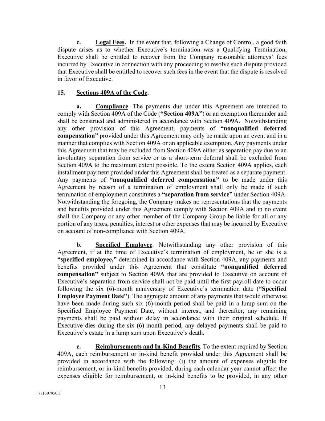 13 781307950.3 c. Legal Fees. In the event that, following a Change of Control, a good faith dispute arises as to whether Executive’s termination was a Qualifying Termination, Executive shall be entitled to recover from the Company reasonable attorneys’ fees incurred by Executive in connection with any proceeding to resolve such dispute provided that Executive shall be entitled to recover such fees in the event that the dispute is resolved in favor of Executive. 15. Sections 409A of the Code. a. Compliance. The payments due under this Agreement are intended to comply with Section 409A of the Code (“Section 409A”) or an exemption thereunder and shall be construed and administered in accordance with Section 409A. Notwithstanding any other provision of this Agreement, payments of “nonqualified deferred compensation” provided under this Agreement may only be made upon an event and in a manner that complies with Section 409A or an applicable exemption. Any payments under this Agreement that may be excluded from Section 409A either as separation pay due to an involuntary separation from service or as a short-term deferral shall be excluded from Section 409A to the maximum extent possible. To the extent Section 409A applies, each installment payment provided under this Agreement shall be treated as a separate payment. Any payments of “nonqualified deferred compensation” to be made under this Agreement by reason of a termination of employment shall only be made if such termination of employment constitutes a “separation from service” under Section 409A. Notwithstanding the foregoing, the Company makes no representations that the payments and benefits provided under this Agreement comply with Section 409A and in no event shall the Company or any other member of the Company Group be liable for all or any portion of any taxes, penalties, interest or other expenses that may be incurred by Executive on account of non-compliance with Section 409A. b. Specified Employee. Notwithstanding any other provision of this Agreement, if at the time of Executive’s termination of employment, he or she is a “specified employee,” determined in accordance with Section 409A, any payments and benefits provided under this Agreement that constitute “nonqualified deferred compensation” subject to Section 409A that are provided to Executive on account of Executive’s separation from service shall not be paid until the first payroll date to occur following the six (6)-month anniversary of Executive’s termination date (“Specified Employee Payment Date”). The aggregate amount of any payments that would otherwise have been made during such six (6)-month period shall be paid in a lump sum on the Specified Employee Payment Date, without interest, and thereafter, any remaining payments shall be paid without delay in accordance with their original schedule. If Executive dies during the six (6)-month period, any delayed payments shall be paid to Executive’s estate in a lump sum upon Executive’s death. c. Reimbursements and In-Kind Benefits. To the extent required by Section 409A, each reimbursement or in-kind benefit provided under this Agreement shall be provided in accordance with the following: (i) the amount of expenses eligible for reimbursement, or in-kind benefits provided, during each calendar year cannot affect the expenses eligible for reimbursement, or in-kind benefits to be provided, in any other