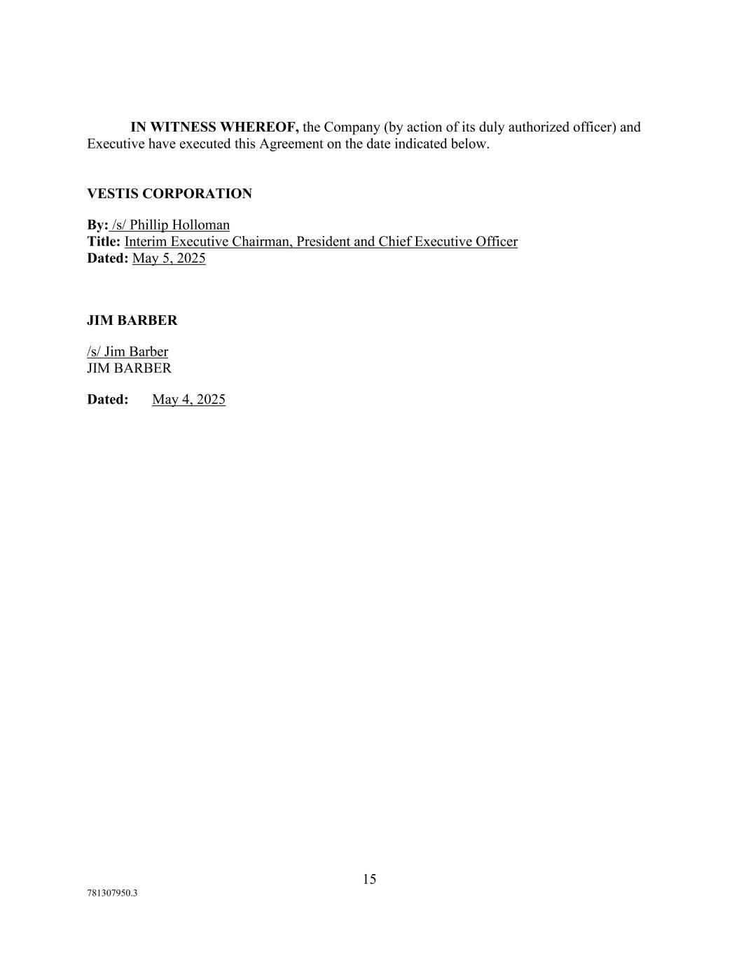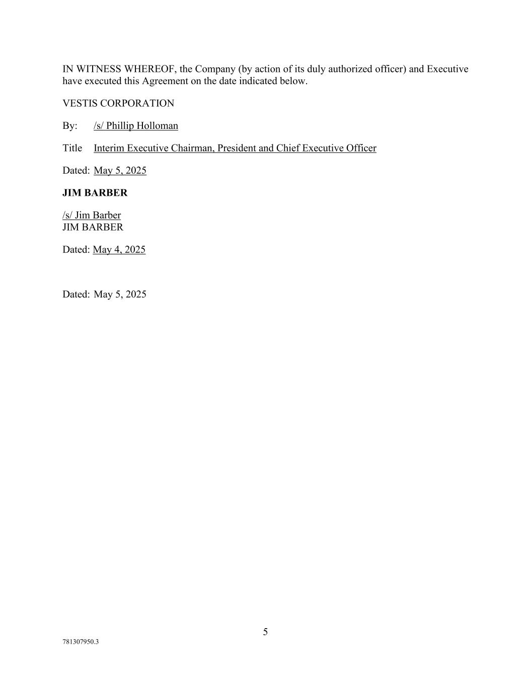 15 781307950.3 IN WITNESS WHEREOF, the Company (by action of its duly authorized officer) and Executive have executed this Agreement on the date indicated below. VESTIS CORPORATION By: /s/ Phillip Holloman Title: Interim Executive Chairman, President and Chief Executive Officer Dated: May 5, 2025 JIM BARBER /s/ Jim Barber JIM BARBER Dated: May 4, 2025