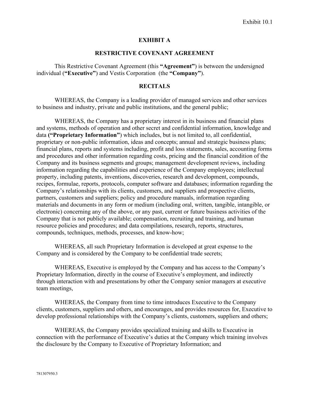 Exhibit 10.1 781307950.3 EXHIBIT A RESTRICTIVE COVENANT AGREEMENT This Restrictive Covenant Agreement (this “Agreement”) is between the undersigned individual (“Executive”) and Vestis Corporation (the “Company”). RECITALS WHEREAS, the Company is a leading provider of managed services and other services to business and industry, private and public institutions, and the general public; WHEREAS, the Company has a proprietary interest in its business and financial plans and systems, methods of operation and other secret and confidential information, knowledge and data (“Proprietary Information”) which includes, but is not limited to, all confidential, proprietary or non-public information, ideas and concepts; annual and strategic business plans; financial plans, reports and systems including, profit and loss statements, sales, accounting forms and procedures and other information regarding costs, pricing and the financial condition of the Company and its business segments and groups; management development reviews, including information regarding the capabilities and experience of the Company employees; intellectual property, including patents, inventions, discoveries, research and development, compounds, recipes, formulae, reports, protocols, computer software and databases; information regarding the Company’s relationships with its clients, customers, and suppliers and prospective clients, partners, customers and suppliers; policy and procedure manuals, information regarding materials and documents in any form or medium (including oral, written, tangible, intangible, or electronic) concerning any of the above, or any past, current or future business activities of the Company that is not publicly available; compensation, recruiting and training, and human resource policies and procedures; and data compilations, research, reports, structures, compounds, techniques, methods, processes, and know-how; WHEREAS, all such Proprietary Information is developed at great expense to the Company and is considered by the Company to be confidential trade secrets; WHEREAS, Executive is employed by the Company and has access to the Company’s Proprietary Information, directly in the course of Executive’s employment, and indirectly through interaction with and presentations by other the Company senior managers at executive team meetings, WHEREAS, the Company from time to time introduces Executive to the Company clients, customers, suppliers and others, and encourages, and provides resources for, Executive to develop professional relationships with the Company’s clients, customers, suppliers and others; WHEREAS, the Company provides specialized training and skills to Executive in connection with the performance of Executive’s duties at the Company which training involves the disclosure by the Company to Executive of Proprietary Information; and