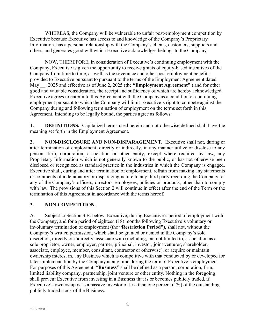 2 781307950.3 WHEREAS, the Company will be vulnerable to unfair post-employment competition by Executive because Executive has access to and knowledge of the Company’s Proprietary Information, has a personal relationship with the Company’s clients, customers, suppliers and others, and generates good will which Executive acknowledges belongs to the Company. NOW, THEREFORE, in consideration of Executive’s continuing employment with the Company, Executive is given the opportunity to receive grants of equity-based incentives of the Company from time to time, as well as the severance and other post-employment benefits provided to Executive pursuant to pursuant to the terms of the Employment Agreement dated May __, 2025 and effective as of June 2, 2025 (the “Employment Agreement” ) and for other good and valuable consideration, the receipt and sufficiency of which are hereby acknowledged, Executive agrees to enter into this Agreement with the Company as a condition of continuing employment pursuant to which the Company will limit Executive’s right to compete against the Company during and following termination of employment on the terms set forth in this Agreement. Intending to be legally bound, the parties agree as follows: 1. DEFINITIONS. Capitalized terms used herein and not otherwise defined shall have the meaning set forth in the Employment Agreement. 2. NON-DISCLOSURE AND NON-DISPARAGEMENT. Executive shall not, during or after termination of employment, directly or indirectly, in any manner utilize or disclose to any person, firm, corporation, association or other entity, except where required by law, any Proprietary Information which is not generally known to the public, or has not otherwise been disclosed or recognized as standard practice in the industries in which the Company is engaged. Executive shall, during and after termination of employment, refrain from making any statements or comments of a defamatory or disparaging nature to any third party regarding the Company, or any of the Company’s officers, directors, employees, policies or products, other than to comply with law. The provisions of this Section 2 will continue in effect after the end of the Term or the termination of this Agreement in accordance with the terms hereof. 3. NON-COMPETITION. A. Subject to Section 3.B. below, Executive, during Executive’s period of employment with the Company, and for a period of eighteen (18) months following Executive’s voluntary or involuntary termination of employment (the “Restriction Period”), shall not, without the Company’s written permission, which shall be granted or denied in the Company’s sole discretion, directly or indirectly, associate with (including, but not limited to, association as a sole proprietor, owner, employer, partner, principal, investor, joint venturer, shareholder, associate, employee, member, consultant, contractor or otherwise), or acquire or maintain ownership interest in, any Business which is competitive with that conducted by or developed for later implementation by the Company at any time during the term of Executive’s employment. For purposes of this Agreement, “Business” shall be defined as a person, corporation, firm, limited liability company, partnership, joint venture or other entity. Nothing in the foregoing shall prevent Executive from investing in a Business that is or becomes publicly traded, if Executive’s ownership is as a passive investor of less than one percent (1%) of the outstanding publicly traded stock of the Business.