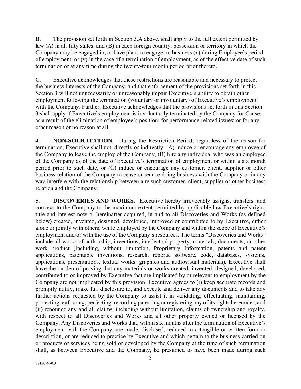 3 781307950.3 B. The provision set forth in Section 3.A above, shall apply to the full extent permitted by law (A) in all fifty states, and (B) in each foreign country, possession or territory in which the Company may be engaged in, or have plans to engage in, business (x) during Employee’s period of employment, or (y) in the case of a termination of employment, as of the effective date of such termination or at any time during the twenty-four month period prior thereto. C. Executive acknowledges that these restrictions are reasonable and necessary to protect the business interests of the Company, and that enforcement of the provisions set forth in this Section 3 will not unnecessarily or unreasonably impair Executive’s ability to obtain other employment following the termination (voluntary or involuntary) of Executive’s employment with the Company. Further, Executive acknowledges that the provisions set forth in this Section 3 shall apply if Executive’s employment is involuntarily terminated by the Company for Cause; as a result of the elimination of employee’s position; for performance-related issues; or for any other reason or no reason at all. 4. NON-SOLICITATION. During the Restriction Period, regardless of the reason for termination, Executive shall not, directly or indirectly: (A) induce or encourage any employee of the Company to leave the employ of the Company, (B) hire any individual who was an employee of the Company as of the date of Executive’s termination of employment or within a six month period prior to such date, or (C) induce or encourage any customer, client, supplier or other business relation of the Company to cease or reduce doing business with the Company or in any way interfere with the relationship between any such customer, client, supplier or other business relation and the Company. 5. DISCOVERIES AND WORKS. Executive hereby irrevocably assigns, transfers, and conveys to the Company to the maximum extent permitted by applicable law Executive’s right, title and interest now or hereinafter acquired, in and to all Discoveries and Works (as defined below) created, invented, designed, developed, improved or contributed to by Executive, either alone or jointly with others, while employed by the Company and within the scope of Executive’s employment and/or with the use of the Company’s resources. The terms “Discoveries and Works” include all works of authorship, inventions, intellectual property, materials, documents, or other work product (including, without limitation, Proprietary Information, patents and patent applications, patentable inventions, research, reports, software, code, databases, systems, applications, presentations, textual works, graphics and audiovisual materials). Executive shall have the burden of proving that any materials or works created, invented, designed, developed, contributed to or improved by Executive that are implicated by or relevant to employment by the Company are not implicated by this provision. Executive agrees to (i) keep accurate records and promptly notify, make full disclosure to, and execute and deliver any documents and to take any further actions requested by the Company to assist it in validating, effectuating, maintaining, protecting, enforcing, perfecting, recording patenting or registering any of its rights hereunder, and (ii) renounce any and all claims, including without limitation, claims of ownership and royalty, with respect to all Discoveries and Works and all other property owned or licensed by the Company. Any Discoveries and Works that, within six months after the termination of Executive’s employment with the Company, are made, disclosed, reduced to a tangible or written form or description, or are reduced to practice by Executive and which pertain to the business carried on or products or services being sold or developed by the Company at the time of such termination shall, as between Executive and the Company, be presumed to have been made during such