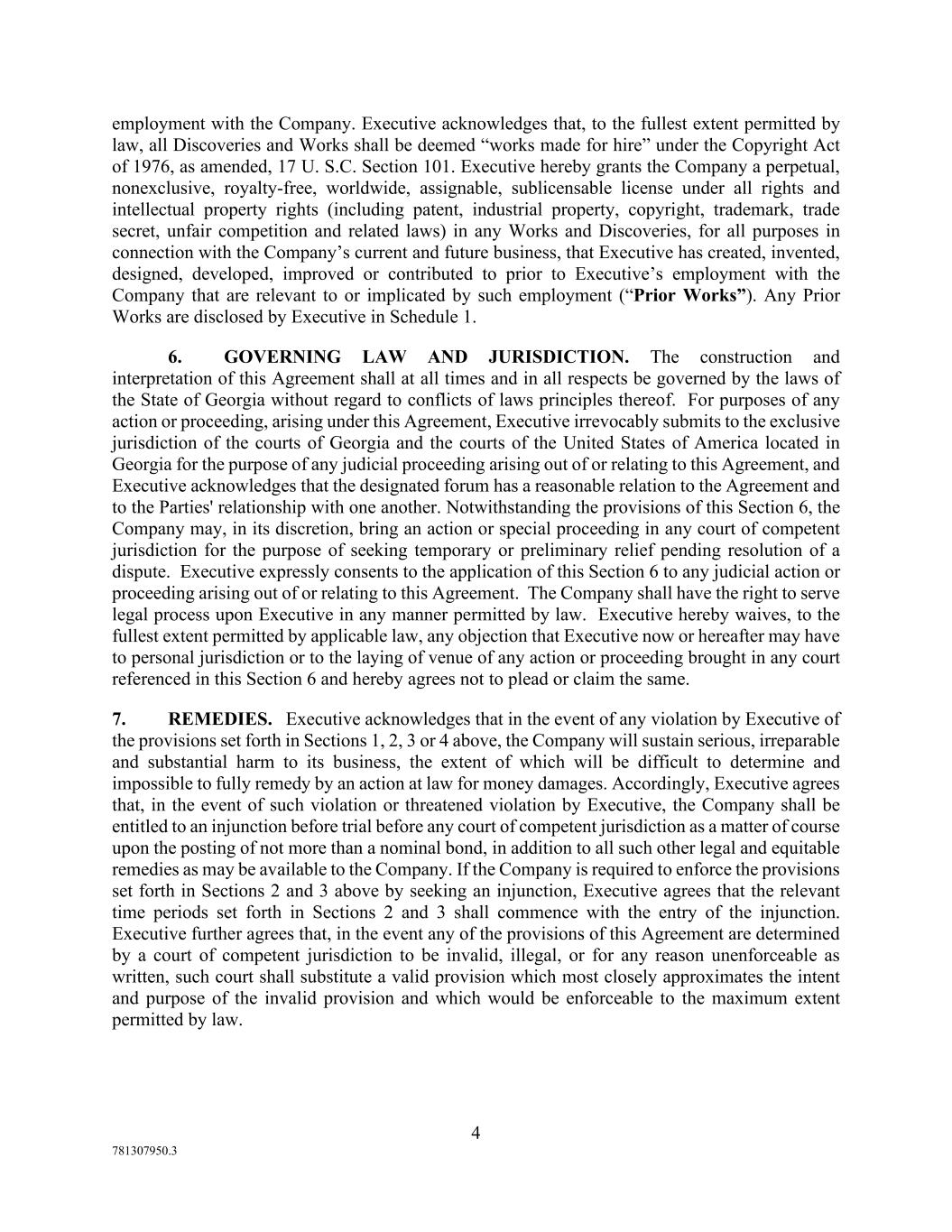 4 781307950.3 employment with the Company. Executive acknowledges that, to the fullest extent permitted by law, all Discoveries and Works shall be deemed “works made for hire” under the Copyright Act of 1976, as amended, 17 U. S.C. Section 101. Executive hereby grants the Company a perpetual, nonexclusive, royalty-free, worldwide, assignable, sublicensable license under all rights and intellectual property rights (including patent, industrial property, copyright, trademark, trade secret, unfair competition and related laws) in any Works and Discoveries, for all purposes in connection with the Company’s current and future business, that Executive has created, invented, designed, developed, improved or contributed to prior to Executive’s employment with the Company that are relevant to or implicated by such employment (“Prior Works”). Any Prior Works are disclosed by Executive in Schedule 1. 6. GOVERNING LAW AND JURISDICTION. The construction and interpretation of this Agreement shall at all times and in all respects be governed by the laws of the State of Georgia without regard to conflicts of laws principles thereof. For purposes of any action or proceeding, arising under this Agreement, Executive irrevocably submits to the exclusive jurisdiction of the courts of Georgia and the courts of the United States of America located in Georgia for the purpose of any judicial proceeding arising out of or relating to this Agreement, and Executive acknowledges that the designated forum has a reasonable relation to the Agreement and to the Parties' relationship with one another. Notwithstanding the provisions of this Section 6, the Company may, in its discretion, bring an action or special proceeding in any court of competent jurisdiction for the purpose of seeking temporary or preliminary relief pending resolution of a dispute. Executive expressly consents to the application of this Section 6 to any judicial action or proceeding arising out of or relating to this Agreement. The Company shall have the right to serve legal process upon Executive in any manner permitted by law. Executive hereby waives, to the fullest extent permitted by applicable law, any objection that Executive now or hereafter may have to personal jurisdiction or to the laying of venue of any action or proceeding brought in any court referenced in this Section 6 and hereby agrees not to plead or claim the same. 7. REMEDIES. Executive acknowledges that in the event of any violation by Executive of the provisions set forth in Sections 1, 2, 3 or 4 above, the Company will sustain serious, irreparable and substantial harm to its business, the extent of which will be difficult to determine and impossible to fully remedy by an action at law for money damages. Accordingly, Executive agrees that, in the event of such violation or threatened violation by Executive, the Company shall be entitled to an injunction before trial before any court of competent jurisdiction as a matter of course upon the posting of not more than a nominal bond, in addition to all such other legal and equitable remedies as may be available to the Company. If the Company is required to enforce the provisions set forth in Sections 2 and 3 above by seeking an injunction, Executive agrees that the relevant time periods set forth in Sections 2 and 3 shall commence with the entry of the injunction. Executive further agrees that, in the event any of the provisions of this Agreement are determined by a court of competent jurisdiction to be invalid, illegal, or for any reason unenforceable as written, such court shall substitute a valid provision which most closely approximates the intent and purpose of the invalid provision and which would be enforceable to the maximum extent permitted by law.