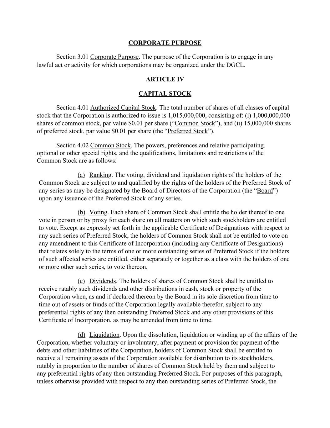 CORPORATE PURPOSE Section 3.01 Corporate Purpose. The purpose of the Corporation is to engage in any lawful act or activity for which corporations may be organized under the DGCL. ARTICLE IV CAPITAL STOCK Section 4.01 Authorized Capital Stock. The total number of shares of all classes of capital stock that the Corporation is authorized to issue is 1,015,000,000, consisting of: (i) 1,000,000,000 shares of common stock, par value $0.01 per share (“Common Stock”), and (ii) 15,000,000 shares of preferred stock, par value $0.01 per share (the “Preferred Stock”). Section 4.02 Common Stock. The powers, preferences and relative participating, optional or other special rights, and the qualifications, limitations and restrictions of the Common Stock are as follows: (a) Ranking. The voting, dividend and liquidation rights of the holders of the Common Stock are subject to and qualified by the rights of the holders of the Preferred Stock of any series as may be designated by the Board of Directors of the Corporation (the “Board”) upon any issuance of the Preferred Stock of any series. (b) Voting. Each share of Common Stock shall entitle the holder thereof to one vote in person or by proxy for each share on all matters on which such stockholders are entitled to vote. Except as expressly set forth in the applicable Certificate of Designations with respect to any such series of Preferred Stock, the holders of Common Stock shall not be entitled to vote on any amendment to this Certificate of Incorporation (including any Certificate of Designations) that relates solely to the terms of one or more outstanding series of Preferred Stock if the holders of such affected series are entitled, either separately or together as a class with the holders of one or more other such series, to vote thereon. (c) Dividends. The holders of shares of Common Stock shall be entitled to receive ratably such dividends and other distributions in cash, stock or property of the Corporation when, as and if declared thereon by the Board in its sole discretion from time to time out of assets or funds of the Corporation legally available therefor, subject to any preferential rights of any then outstanding Preferred Stock and any other provisions of this Certificate of Incorporation, as may be amended from time to time. (d) Liquidation. Upon the dissolution, liquidation or winding up of the affairs of the Corporation, whether voluntary or involuntary, after payment or provision for payment of the debts and other liabilities of the Corporation, holders of Common Stock shall be entitled to receive all remaining assets of the Corporation available for distribution to its stockholders, ratably in proportion to the number of shares of Common Stock held by them and subject to any preferential rights of any then outstanding Preferred Stock. For purposes of this paragraph, unless otherwise provided with respect to any then outstanding series of Preferred Stock, the
