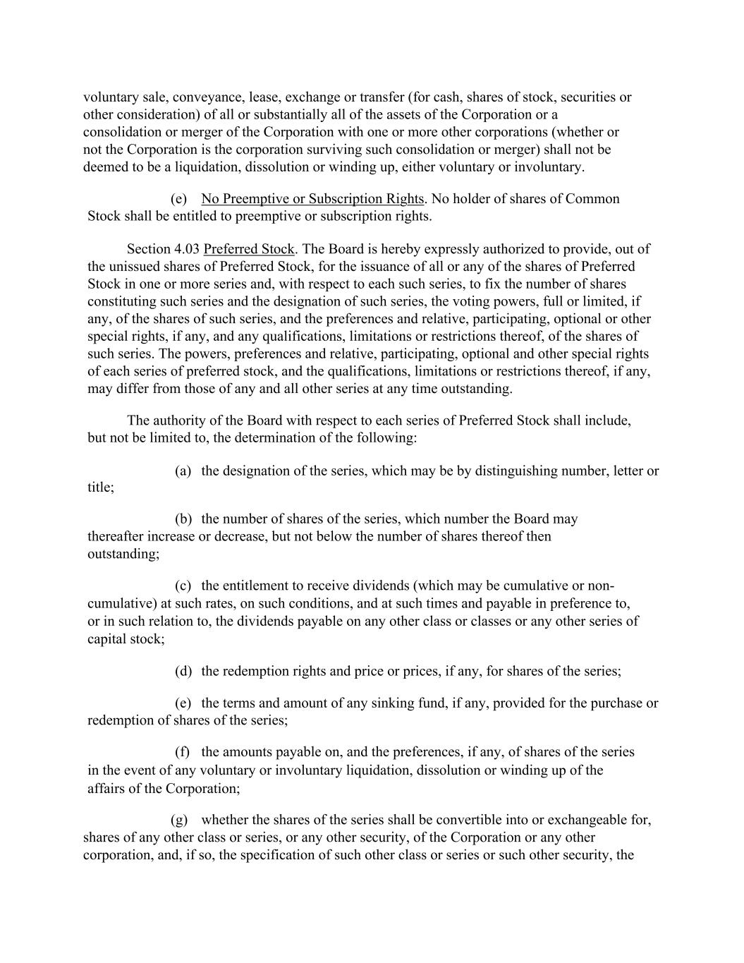 voluntary sale, conveyance, lease, exchange or transfer (for cash, shares of stock, securities or other consideration) of all or substantially all of the assets of the Corporation or a consolidation or merger of the Corporation with one or more other corporations (whether or not the Corporation is the corporation surviving such consolidation or merger) shall not be deemed to be a liquidation, dissolution or winding up, either voluntary or involuntary. (e) No Preemptive or Subscription Rights. No holder of shares of Common Stock shall be entitled to preemptive or subscription rights. Section 4.03 Preferred Stock. The Board is hereby expressly authorized to provide, out of the unissued shares of Preferred Stock, for the issuance of all or any of the shares of Preferred Stock in one or more series and, with respect to each such series, to fix the number of shares constituting such series and the designation of such series, the voting powers, full or limited, if any, of the shares of such series, and the preferences and relative, participating, optional or other special rights, if any, and any qualifications, limitations or restrictions thereof, of the shares of such series. The powers, preferences and relative, participating, optional and other special rights of each series of preferred stock, and the qualifications, limitations or restrictions thereof, if any, may differ from those of any and all other series at any time outstanding. The authority of the Board with respect to each series of Preferred Stock shall include, but not be limited to, the determination of the following: (a) the designation of the series, which may be by distinguishing number, letter or title; (b) the number of shares of the series, which number the Board may thereafter increase or decrease, but not below the number of shares thereof then outstanding; (c) the entitlement to receive dividends (which may be cumulative or non- cumulative) at such rates, on such conditions, and at such times and payable in preference to, or in such relation to, the dividends payable on any other class or classes or any other series of capital stock; (d) the redemption rights and price or prices, if any, for shares of the series; (e) the terms and amount of any sinking fund, if any, provided for the purchase or redemption of shares of the series; (f) the amounts payable on, and the preferences, if any, of shares of the series in the event of any voluntary or involuntary liquidation, dissolution or winding up of the affairs of the Corporation; (g) whether the shares of the series shall be convertible into or exchangeable for, shares of any other class or series, or any other security, of the Corporation or any other corporation, and, if so, the specification of such other class or series or such other security, the