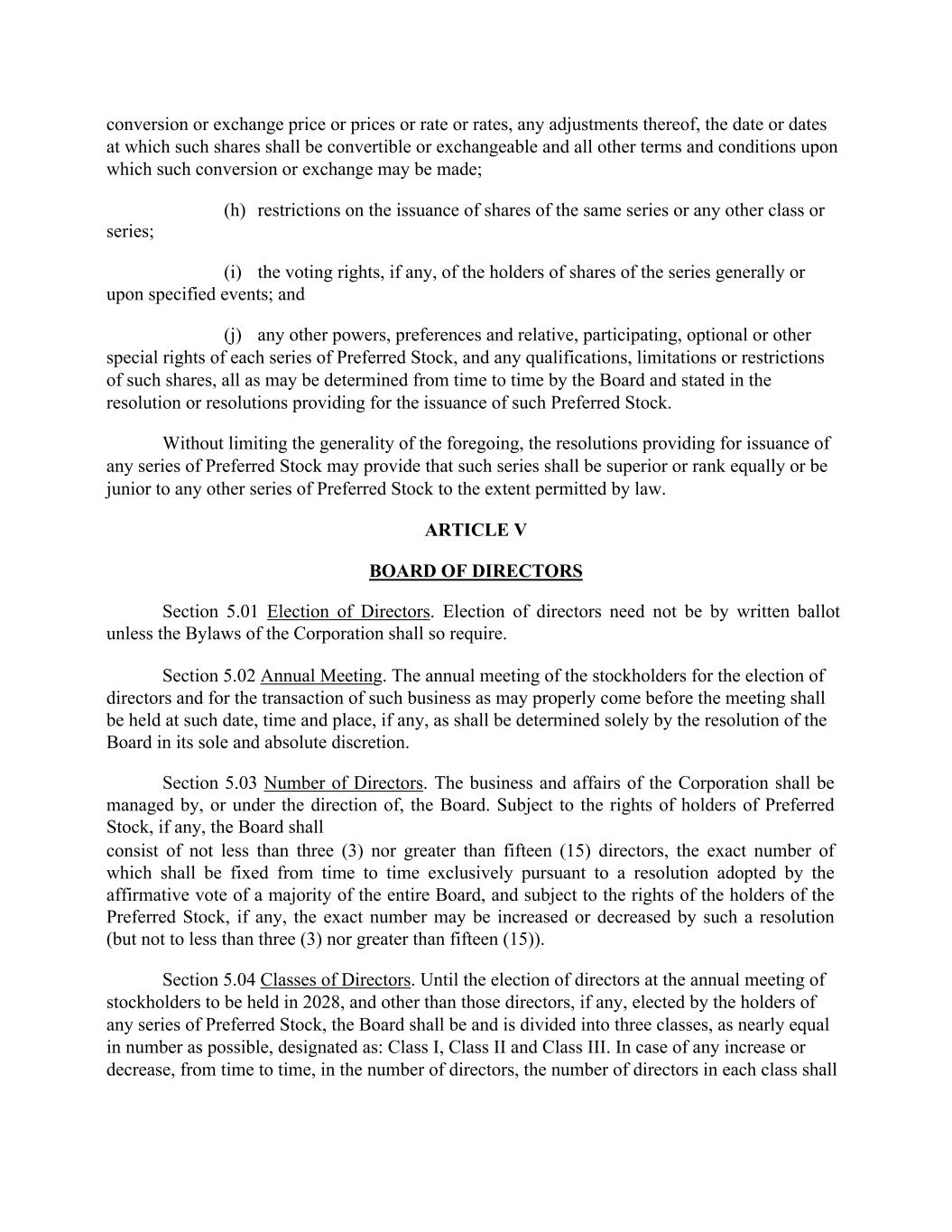 conversion or exchange price or prices or rate or rates, any adjustments thereof, the date or dates at which such shares shall be convertible or exchangeable and all other terms and conditions upon which such conversion or exchange may be made; (h) restrictions on the issuance of shares of the same series or any other class or series; (i) the voting rights, if any, of the holders of shares of the series generally or upon specified events; and (j) any other powers, preferences and relative, participating, optional or other special rights of each series of Preferred Stock, and any qualifications, limitations or restrictions of such shares, all as may be determined from time to time by the Board and stated in the resolution or resolutions providing for the issuance of such Preferred Stock. Without limiting the generality of the foregoing, the resolutions providing for issuance of any series of Preferred Stock may provide that such series shall be superior or rank equally or be junior to any other series of Preferred Stock to the extent permitted by law. ARTICLE V BOARD OF DIRECTORS Section 5.01 Election of Directors. Election of directors need not be by written ballot unless the Bylaws of the Corporation shall so require. Section 5.02 Annual Meeting. The annual meeting of the stockholders for the election of directors and for the transaction of such business as may properly come before the meeting shall be held at such date, time and place, if any, as shall be determined solely by the resolution of the Board in its sole and absolute discretion. Section 5.03 Number of Directors. The business and affairs of the Corporation shall be managed by, or under the direction of, the Board. Subject to the rights of holders of Preferred Stock, if any, the Board shall consist of not less than three (3) nor greater than fifteen (15) directors, the exact number of which shall be fixed from time to time exclusively pursuant to a resolution adopted by the affirmative vote of a majority of the entire Board, and subject to the rights of the holders of the Preferred Stock, if any, the exact number may be increased or decreased by such a resolution (but not to less than three (3) nor greater than fifteen (15)). Section 5.04 Classes of Directors. Until the election of directors at the annual meeting of stockholders to be held in 2028, and other than those directors, if any, elected by the holders of any series of Preferred Stock, the Board shall be and is divided into three classes, as nearly equal in number as possible, designated as: Class I, Class II and Class III. In case of any increase or decrease, from time to time, in the number of directors, the number of directors in each class shall
