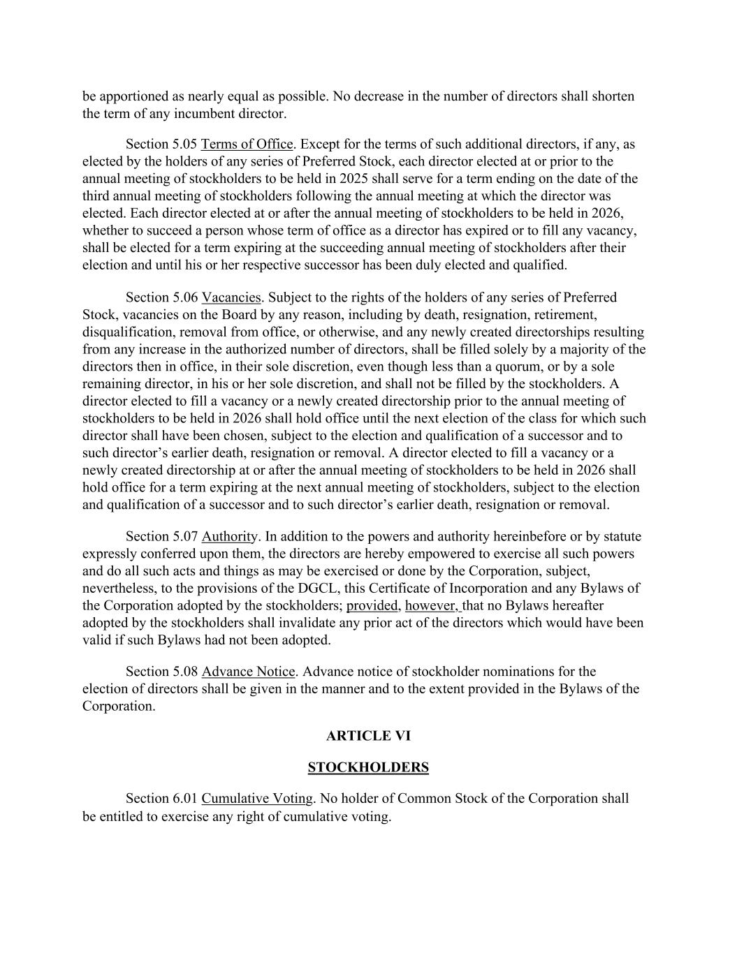 be apportioned as nearly equal as possible. No decrease in the number of directors shall shorten the term of any incumbent director. Section 5.05 Terms of Office. Except for the terms of such additional directors, if any, as elected by the holders of any series of Preferred Stock, each director elected at or prior to the annual meeting of stockholders to be held in 2025 shall serve for a term ending on the date of the third annual meeting of stockholders following the annual meeting at which the director was elected. Each director elected at or after the annual meeting of stockholders to be held in 2026, whether to succeed a person whose term of office as a director has expired or to fill any vacancy, shall be elected for a term expiring at the succeeding annual meeting of stockholders after their election and until his or her respective successor has been duly elected and qualified. Section 5.06 Vacancies. Subject to the rights of the holders of any series of Preferred Stock, vacancies on the Board by any reason, including by death, resignation, retirement, disqualification, removal from office, or otherwise, and any newly created directorships resulting from any increase in the authorized number of directors, shall be filled solely by a majority of the directors then in office, in their sole discretion, even though less than a quorum, or by a sole remaining director, in his or her sole discretion, and shall not be filled by the stockholders. A director elected to fill a vacancy or a newly created directorship prior to the annual meeting of stockholders to be held in 2026 shall hold office until the next election of the class for which such director shall have been chosen, subject to the election and qualification of a successor and to such director’s earlier death, resignation or removal. A director elected to fill a vacancy or a newly created directorship at or after the annual meeting of stockholders to be held in 2026 shall hold office for a term expiring at the next annual meeting of stockholders, subject to the election and qualification of a successor and to such director’s earlier death, resignation or removal. Section 5.07 Authority. In addition to the powers and authority hereinbefore or by statute expressly conferred upon them, the directors are hereby empowered to exercise all such powers and do all such acts and things as may be exercised or done by the Corporation, subject, nevertheless, to the provisions of the DGCL, this Certificate of Incorporation and any Bylaws of the Corporation adopted by the stockholders; provided, however, that no Bylaws hereafter adopted by the stockholders shall invalidate any prior act of the directors which would have been valid if such Bylaws had not been adopted. Section 5.08 Advance Notice. Advance notice of stockholder nominations for the election of directors shall be given in the manner and to the extent provided in the Bylaws of the Corporation. ARTICLE VI STOCKHOLDERS Section 6.01 Cumulative Voting. No holder of Common Stock of the Corporation shall be entitled to exercise any right of cumulative voting.