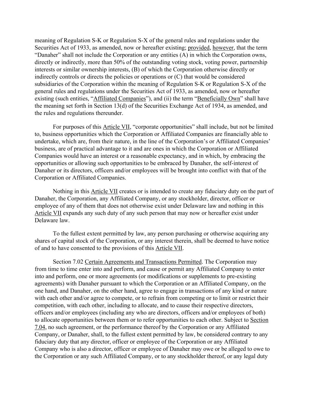 meaning of Regulation S-K or Regulation S-X of the general rules and regulations under the Securities Act of 1933, as amended, now or hereafter existing; provided, however, that the term “Danaher” shall not include the Corporation or any entities (A) in which the Corporation owns, directly or indirectly, more than 50% of the outstanding voting stock, voting power, partnership interests or similar ownership interests, (B) of which the Corporation otherwise directly or indirectly controls or directs the policies or operations or (C) that would be considered subsidiaries of the Corporation within the meaning of Regulation S-K or Regulation S-X of the general rules and regulations under the Securities Act of 1933, as amended, now or hereafter existing (such entities, “Affiliated Companies”), and (ii) the term “Beneficially Own” shall have the meaning set forth in Section 13(d) of the Securities Exchange Act of 1934, as amended, and the rules and regulations thereunder. For purposes of this Article VII, “corporate opportunities” shall include, but not be limited to, business opportunities which the Corporation or Affiliated Companies are financially able to undertake, which are, from their nature, in the line of the Corporation’s or Affiliated Companies’ business, are of practical advantage to it and are ones in which the Corporation or Affiliated Companies would have an interest or a reasonable expectancy, and in which, by embracing the opportunities or allowing such opportunities to be embraced by Danaher, the self-interest of Danaher or its directors, officers and/or employees will be brought into conflict with that of the Corporation or Affiliated Companies. Nothing in this Article VII creates or is intended to create any fiduciary duty on the part of Danaher, the Corporation, any Affiliated Company, or any stockholder, director, officer or employee of any of them that does not otherwise exist under Delaware law and nothing in this Article VII expands any such duty of any such person that may now or hereafter exist under Delaware law. To the fullest extent permitted by law, any person purchasing or otherwise acquiring any shares of capital stock of the Corporation, or any interest therein, shall be deemed to have notice of and to have consented to the provisions of this Article VII. Section 7.02 Certain Agreements and Transactions Permitted. The Corporation may from time to time enter into and perform, and cause or permit any Affiliated Company to enter into and perform, one or more agreements (or modifications or supplements to pre-existing agreements) with Danaher pursuant to which the Corporation or an Affiliated Company, on the one hand, and Danaher, on the other hand, agree to engage in transactions of any kind or nature with each other and/or agree to compete, or to refrain from competing or to limit or restrict their competition, with each other, including to allocate, and to cause their respective directors, officers and/or employees (including any who are directors, officers and/or employees of both) to allocate opportunities between them or to refer opportunities to each other. Subject to Section 7.04, no such agreement, or the performance thereof by the Corporation or any Affiliated Company, or Danaher, shall, to the fullest extent permitted by law, be considered contrary to any fiduciary duty that any director, officer or employee of the Corporation or any Affiliated Company who is also a director, officer or employee of Danaher may owe or be alleged to owe to the Corporation or any such Affiliated Company, or to any stockholder thereof, or any legal duty