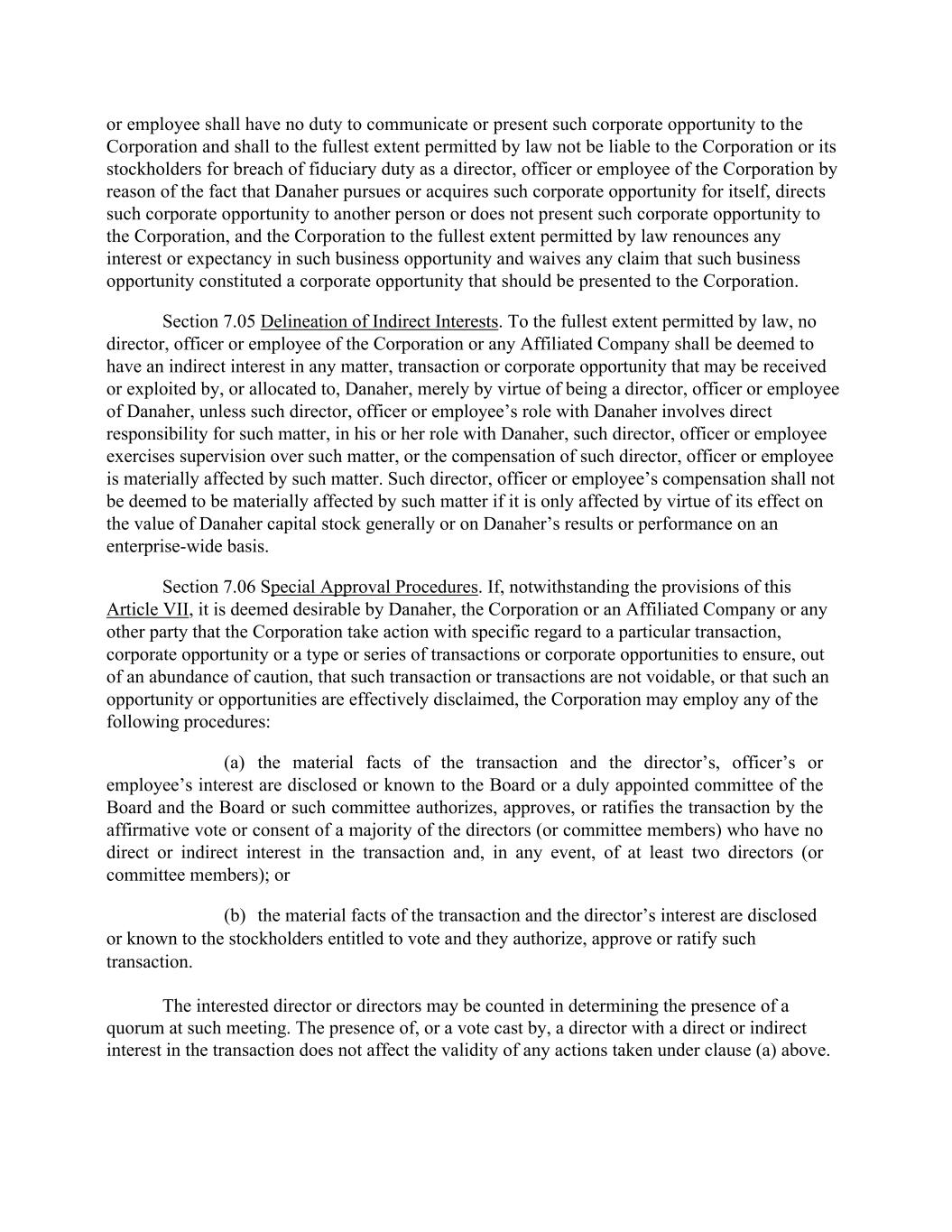 or employee shall have no duty to communicate or present such corporate opportunity to the Corporation and shall to the fullest extent permitted by law not be liable to the Corporation or its stockholders for breach of fiduciary duty as a director, officer or employee of the Corporation by reason of the fact that Danaher pursues or acquires such corporate opportunity for itself, directs such corporate opportunity to another person or does not present such corporate opportunity to the Corporation, and the Corporation to the fullest extent permitted by law renounces any interest or expectancy in such business opportunity and waives any claim that such business opportunity constituted a corporate opportunity that should be presented to the Corporation. Section 7.05 Delineation of Indirect Interests. To the fullest extent permitted by law, no director, officer or employee of the Corporation or any Affiliated Company shall be deemed to have an indirect interest in any matter, transaction or corporate opportunity that may be received or exploited by, or allocated to, Danaher, merely by virtue of being a director, officer or employee of Danaher, unless such director, officer or employee’s role with Danaher involves direct responsibility for such matter, in his or her role with Danaher, such director, officer or employee exercises supervision over such matter, or the compensation of such director, officer or employee is materially affected by such matter. Such director, officer or employee’s compensation shall not be deemed to be materially affected by such matter if it is only affected by virtue of its effect on the value of Danaher capital stock generally or on Danaher’s results or performance on an enterprise-wide basis. Section 7.06 Special Approval Procedures. If, notwithstanding the provisions of this Article VII, it is deemed desirable by Danaher, the Corporation or an Affiliated Company or any other party that the Corporation take action with specific regard to a particular transaction, corporate opportunity or a type or series of transactions or corporate opportunities to ensure, out of an abundance of caution, that such transaction or transactions are not voidable, or that such an opportunity or opportunities are effectively disclaimed, the Corporation may employ any of the following procedures: (a) the material facts of the transaction and the director’s, officer’s or employee’s interest are disclosed or known to the Board or a duly appointed committee of the Board and the Board or such committee authorizes, approves, or ratifies the transaction by the affirmative vote or consent of a majority of the directors (or committee members) who have no direct or indirect interest in the transaction and, in any event, of at least two directors (or committee members); or (b) the material facts of the transaction and the director’s interest are disclosed or known to the stockholders entitled to vote and they authorize, approve or ratify such transaction. The interested director or directors may be counted in determining the presence of a quorum at such meeting. The presence of, or a vote cast by, a director with a direct or indirect interest in the transaction does not affect the validity of any actions taken under clause (a) above.