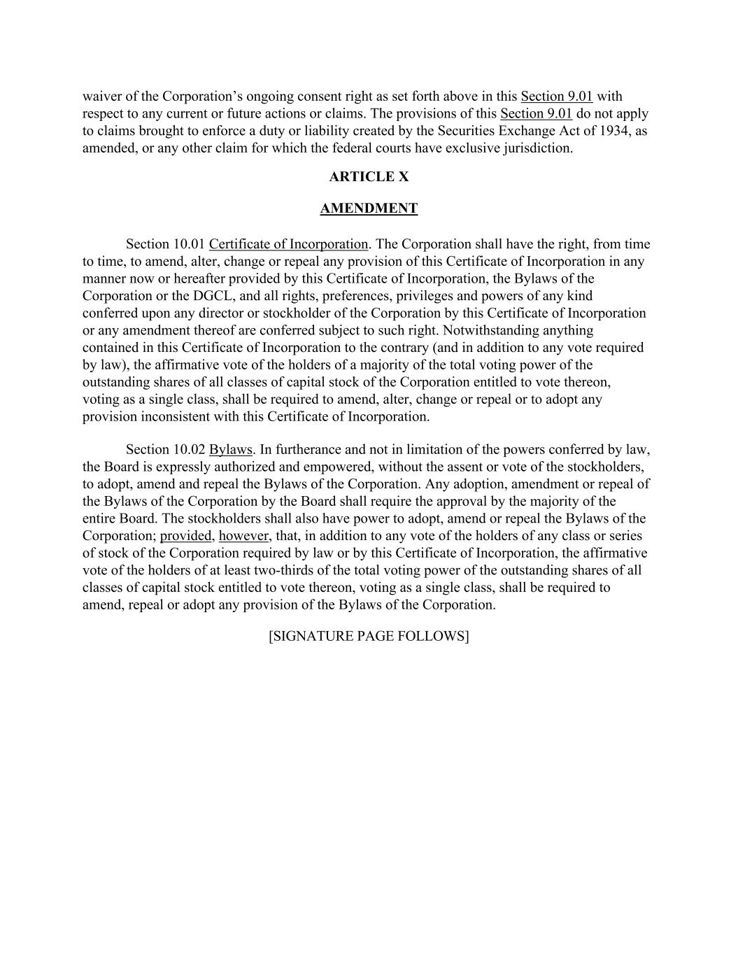 waiver of the Corporation’s ongoing consent right as set forth above in this Section 9.01 with respect to any current or future actions or claims. The provisions of this Section 9.01 do not apply to claims brought to enforce a duty or liability created by the Securities Exchange Act of 1934, as amended, or any other claim for which the federal courts have exclusive jurisdiction. ARTICLE X AMENDMENT Section 10.01 Certificate of Incorporation. The Corporation shall have the right, from time to time, to amend, alter, change or repeal any provision of this Certificate of Incorporation in any manner now or hereafter provided by this Certificate of Incorporation, the Bylaws of the Corporation or the DGCL, and all rights, preferences, privileges and powers of any kind conferred upon any director or stockholder of the Corporation by this Certificate of Incorporation or any amendment thereof are conferred subject to such right. Notwithstanding anything contained in this Certificate of Incorporation to the contrary (and in addition to any vote required by law), the affirmative vote of the holders of a majority of the total voting power of the outstanding shares of all classes of capital stock of the Corporation entitled to vote thereon, voting as a single class, shall be required to amend, alter, change or repeal or to adopt any provision inconsistent with this Certificate of Incorporation. Section 10.02 Bylaws. In furtherance and not in limitation of the powers conferred by law, the Board is expressly authorized and empowered, without the assent or vote of the stockholders, to adopt, amend and repeal the Bylaws of the Corporation. Any adoption, amendment or repeal of the Bylaws of the Corporation by the Board shall require the approval by the majority of the entire Board. The stockholders shall also have power to adopt, amend or repeal the Bylaws of the Corporation; provided, however, that, in addition to any vote of the holders of any class or series of stock of the Corporation required by law or by this Certificate of Incorporation, the affirmative vote of the holders of at least two-thirds of the total voting power of the outstanding shares of all classes of capital stock entitled to vote thereon, voting as a single class, shall be required to amend, repeal or adopt any provision of the Bylaws of the Corporation. [SIGNATURE PAGE FOLLOWS]