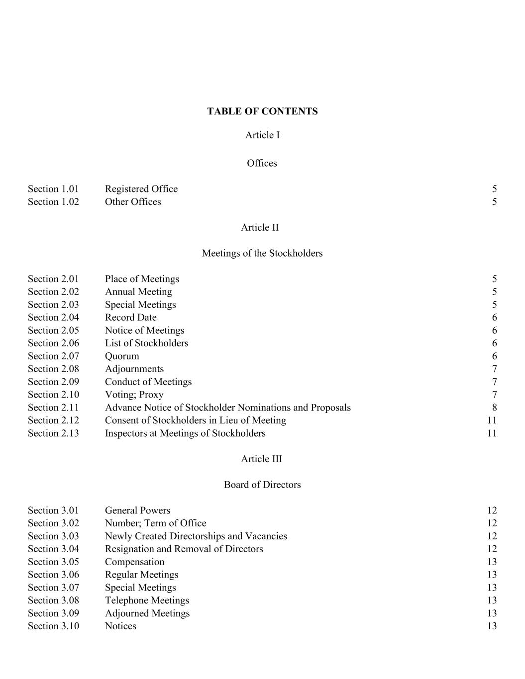TABLE OF CONTENTS Article I Offices Section 1.01 Registered Office 5 Section 1.02 Other Offices 5 Article II Meetings of the Stockholders Section 2.01 Place of Meetings 5 Section 2.02 Annual Meeting 5 Section 2.03 Special Meetings 5 Section 2.04 Record Date 6 Section 2.05 Notice of Meetings 6 Section 2.06 List of Stockholders 6 Section 2.07 Quorum 6 Section 2.08 Adjournments 7 Section 2.09 Conduct of Meetings 7 Section 2.10 Voting; Proxy 7 Section 2.11 Advance Notice of Stockholder Nominations and Proposals 8 Section 2.12 Consent of Stockholders in Lieu of Meeting 11 Section 2.13 Inspectors at Meetings of Stockholders 11 Article III Board of Directors Section 3.01 General Powers 12 Section 3.02 Number; Term of Office 12 Section 3.03 Newly Created Directorships and Vacancies 12 Section 3.04 Resignation and Removal of Directors 12 Section 3.05 Compensation 13 Section 3.06 Regular Meetings 13 Section 3.07 Special Meetings 13 Section 3.08 Telephone Meetings 13 Section 3.09 Adjourned Meetings 13 Section 3.10 Notices 13