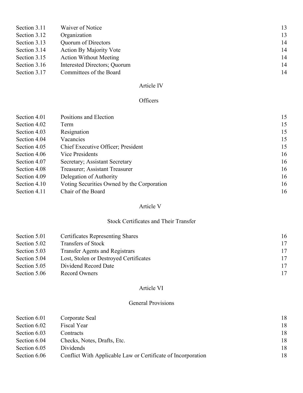 Section 3.11 Waiver of Notice 13 Section 3.12 Organization 13 Section 3.13 Quorum of Directors 14 Section 3.14 Action By Majority Vote 14 Section 3.15 Action Without Meeting 14 Section 3.16 Interested Directors; Quorum 14 Section 3.17 Committees of the Board 14 Article IV Officers Section 4.01 Positions and Election 15 Section 4.02 Term 15 Section 4.03 Resignation 15 Section 4.04 Vacancies 15 Section 4.05 Chief Executive Officer; President 15 Section 4.06 Vice Presidents 16 Section 4.07 Secretary; Assistant Secretary 16 Section 4.08 Treasurer; Assistant Treasurer 16 Section 4.09 Delegation of Authority 16 Section 4.10 Voting Securities Owned by the Corporation 16 Section 4.11 Chair of the Board 16 Article V Stock Certificates and Their Transfer Section 5.01 Certificates Representing Shares 16 Section 5.02 Transfers of Stock 17 Section 5.03 Transfer Agents and Registrars 17 Section 5.04 Lost, Stolen or Destroyed Certificates 17 Section 5.05 Dividend Record Date 17 Section 5.06 Record Owners 17 Article VI General Provisions Section 6.01 Corporate Seal 18 Section 6.02 Fiscal Year 18 Section 6.03 Contracts 18 Section 6.04 Checks, Notes, Drafts, Etc. 18 Section 6.05 Dividends 18 Section 6.06 Conflict With Applicable Law or Certificate of Incorporation 18