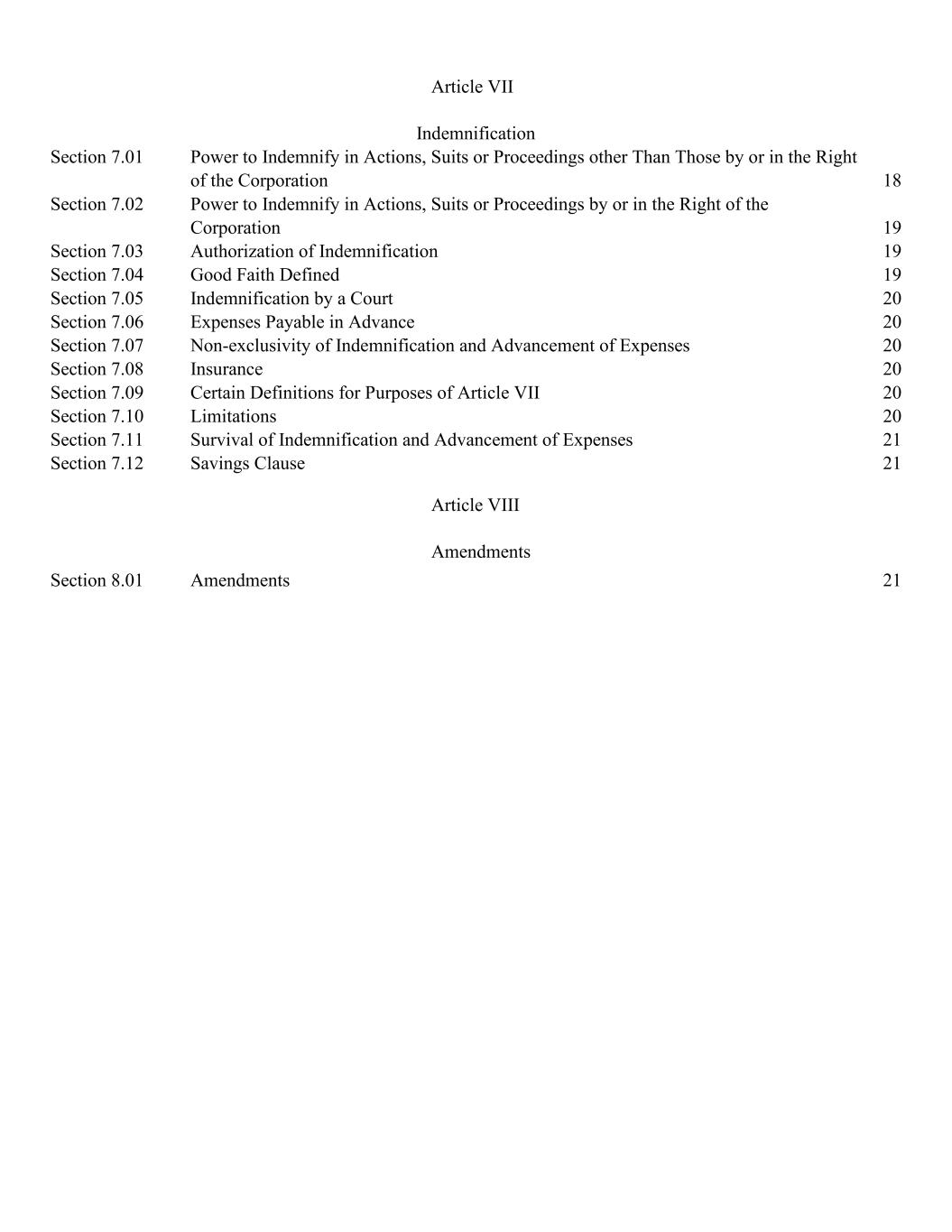 Article VII Indemnification Section 7.01 Power to Indemnify in Actions, Suits or Proceedings other Than Those by or in the Right of the Corporation 18 Section 7.02 Power to Indemnify in Actions, Suits or Proceedings by or in the Right of the Corporation 19 Section 7.03 Authorization of Indemnification 19 Section 7.04 Good Faith Defined 19 Section 7.05 Indemnification by a Court 20 Section 7.06 Expenses Payable in Advance 20 Section 7.07 Non-exclusivity of Indemnification and Advancement of Expenses 20 Section 7.08 Insurance 20 Section 7.09 Certain Definitions for Purposes of Article VII 20 Section 7.10 Limitations 20 Section 7.11 Survival of Indemnification and Advancement of Expenses 21 Section 7.12 Savings Clause 21 Article VIII Amendments Section 8.01 Amendments 21