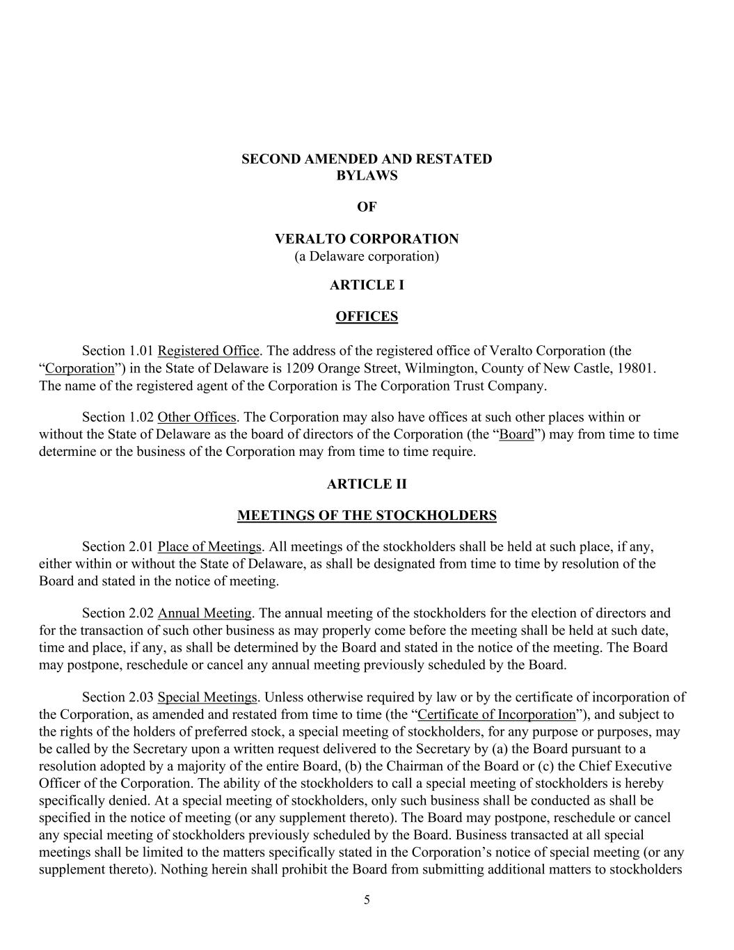 5 SECOND AMENDED AND RESTATED BYLAWS OF VERALTO CORPORATION (a Delaware corporation) ARTICLE I OFFICES Section 1.01 Registered Office. The address of the registered office of Veralto Corporation (the “Corporation”) in the State of Delaware is 1209 Orange Street, Wilmington, County of New Castle, 19801. The name of the registered agent of the Corporation is The Corporation Trust Company. Section 1.02 Other Offices. The Corporation may also have offices at such other places within or without the State of Delaware as the board of directors of the Corporation (the “Board”) may from time to time determine or the business of the Corporation may from time to time require. ARTICLE II MEETINGS OF THE STOCKHOLDERS Section 2.01 Place of Meetings. All meetings of the stockholders shall be held at such place, if any, either within or without the State of Delaware, as shall be designated from time to time by resolution of the Board and stated in the notice of meeting. Section 2.02 Annual Meeting. The annual meeting of the stockholders for the election of directors and for the transaction of such other business as may properly come before the meeting shall be held at such date, time and place, if any, as shall be determined by the Board and stated in the notice of the meeting. The Board may postpone, reschedule or cancel any annual meeting previously scheduled by the Board. Section 2.03 Special Meetings. Unless otherwise required by law or by the certificate of incorporation of the Corporation, as amended and restated from time to time (the “Certificate of Incorporation”), and subject to the rights of the holders of preferred stock, a special meeting of stockholders, for any purpose or purposes, may be called by the Secretary upon a written request delivered to the Secretary by (a) the Board pursuant to a resolution adopted by a majority of the entire Board, (b) the Chairman of the Board or (c) the Chief Executive Officer of the Corporation. The ability of the stockholders to call a special meeting of stockholders is hereby specifically denied. At a special meeting of stockholders, only such business shall be conducted as shall be specified in the notice of meeting (or any supplement thereto). The Board may postpone, reschedule or cancel any special meeting of stockholders previously scheduled by the Board. Business transacted at all special meetings shall be limited to the matters specifically stated in the Corporation’s notice of special meeting (or any supplement thereto). Nothing herein shall prohibit the Board from submitting additional matters to stockholders