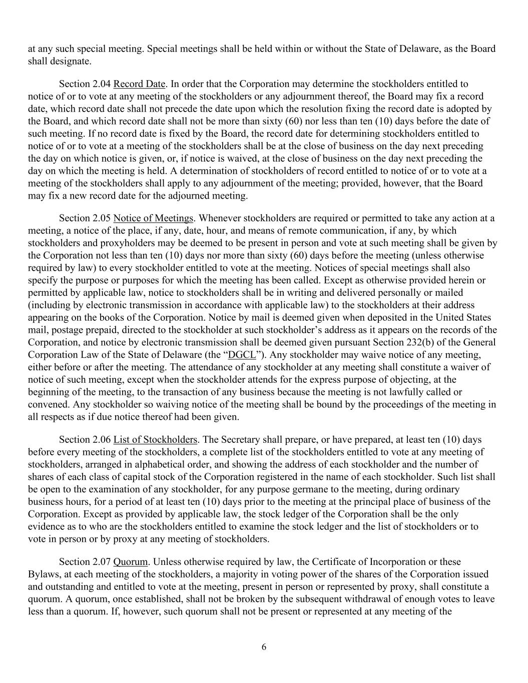 6 at any such special meeting. Special meetings shall be held within or without the State of Delaware, as the Board shall designate. Section 2.04 Record Date. In order that the Corporation may determine the stockholders entitled to notice of or to vote at any meeting of the stockholders or any adjournment thereof, the Board may fix a record date, which record date shall not precede the date upon which the resolution fixing the record date is adopted by the Board, and which record date shall not be more than sixty (60) nor less than ten (10) days before the date of such meeting. If no record date is fixed by the Board, the record date for determining stockholders entitled to notice of or to vote at a meeting of the stockholders shall be at the close of business on the day next preceding the day on which notice is given, or, if notice is waived, at the close of business on the day next preceding the day on which the meeting is held. A determination of stockholders of record entitled to notice of or to vote at a meeting of the stockholders shall apply to any adjournment of the meeting; provided, however, that the Board may fix a new record date for the adjourned meeting. Section 2.05 Notice of Meetings. Whenever stockholders are required or permitted to take any action at a meeting, a notice of the place, if any, date, hour, and means of remote communication, if any, by which stockholders and proxyholders may be deemed to be present in person and vote at such meeting shall be given by the Corporation not less than ten (10) days nor more than sixty (60) days before the meeting (unless otherwise required by law) to every stockholder entitled to vote at the meeting. Notices of special meetings shall also specify the purpose or purposes for which the meeting has been called. Except as otherwise provided herein or permitted by applicable law, notice to stockholders shall be in writing and delivered personally or mailed (including by electronic transmission in accordance with applicable law) to the stockholders at their address appearing on the books of the Corporation. Notice by mail is deemed given when deposited in the United States mail, postage prepaid, directed to the stockholder at such stockholder’s address as it appears on the records of the Corporation, and notice by electronic transmission shall be deemed given pursuant Section 232(b) of the General Corporation Law of the State of Delaware (the “DGCL”). Any stockholder may waive notice of any meeting, either before or after the meeting. The attendance of any stockholder at any meeting shall constitute a waiver of notice of such meeting, except when the stockholder attends for the express purpose of objecting, at the beginning of the meeting, to the transaction of any business because the meeting is not lawfully called or convened. Any stockholder so waiving notice of the meeting shall be bound by the proceedings of the meeting in all respects as if due notice thereof had been given. Section 2.06 List of Stockholders. The Secretary shall prepare, or have prepared, at least ten (10) days before every meeting of the stockholders, a complete list of the stockholders entitled to vote at any meeting of stockholders, arranged in alphabetical order, and showing the address of each stockholder and the number of shares of each class of capital stock of the Corporation registered in the name of each stockholder. Such list shall be open to the examination of any stockholder, for any purpose germane to the meeting, during ordinary business hours, for a period of at least ten (10) days prior to the meeting at the principal place of business of the Corporation. Except as provided by applicable law, the stock ledger of the Corporation shall be the only evidence as to who are the stockholders entitled to examine the stock ledger and the list of stockholders or to vote in person or by proxy at any meeting of stockholders. Section 2.07 Quorum. Unless otherwise required by law, the Certificate of Incorporation or these Bylaws, at each meeting of the stockholders, a majority in voting power of the shares of the Corporation issued and outstanding and entitled to vote at the meeting, present in person or represented by proxy, shall constitute a quorum. A quorum, once established, shall not be broken by the subsequent withdrawal of enough votes to leave less than a quorum. If, however, such quorum shall not be present or represented at any meeting of the