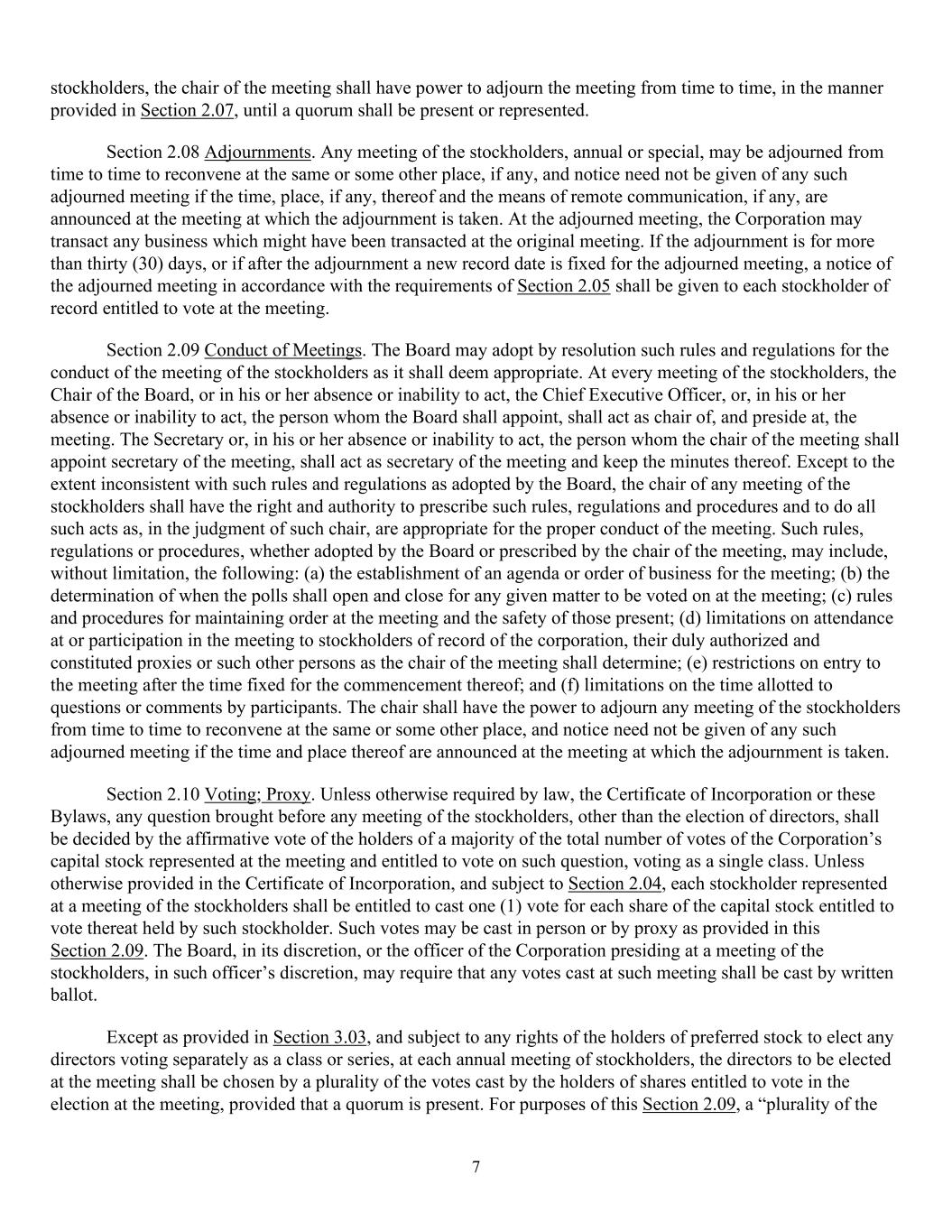 7 stockholders, the chair of the meeting shall have power to adjourn the meeting from time to time, in the manner provided in Section 2.07, until a quorum shall be present or represented. Section 2.08 Adjournments. Any meeting of the stockholders, annual or special, may be adjourned from time to time to reconvene at the same or some other place, if any, and notice need not be given of any such adjourned meeting if the time, place, if any, thereof and the means of remote communication, if any, are announced at the meeting at which the adjournment is taken. At the adjourned meeting, the Corporation may transact any business which might have been transacted at the original meeting. If the adjournment is for more than thirty (30) days, or if after the adjournment a new record date is fixed for the adjourned meeting, a notice of the adjourned meeting in accordance with the requirements of Section 2.05 shall be given to each stockholder of record entitled to vote at the meeting. Section 2.09 Conduct of Meetings. The Board may adopt by resolution such rules and regulations for the conduct of the meeting of the stockholders as it shall deem appropriate. At every meeting of the stockholders, the Chair of the Board, or in his or her absence or inability to act, the Chief Executive Officer, or, in his or her absence or inability to act, the person whom the Board shall appoint, shall act as chair of, and preside at, the meeting. The Secretary or, in his or her absence or inability to act, the person whom the chair of the meeting shall appoint secretary of the meeting, shall act as secretary of the meeting and keep the minutes thereof. Except to the extent inconsistent with such rules and regulations as adopted by the Board, the chair of any meeting of the stockholders shall have the right and authority to prescribe such rules, regulations and procedures and to do all such acts as, in the judgment of such chair, are appropriate for the proper conduct of the meeting. Such rules, regulations or procedures, whether adopted by the Board or prescribed by the chair of the meeting, may include, without limitation, the following: (a) the establishment of an agenda or order of business for the meeting; (b) the determination of when the polls shall open and close for any given matter to be voted on at the meeting; (c) rules and procedures for maintaining order at the meeting and the safety of those present; (d) limitations on attendance at or participation in the meeting to stockholders of record of the corporation, their duly authorized and constituted proxies or such other persons as the chair of the meeting shall determine; (e) restrictions on entry to the meeting after the time fixed for the commencement thereof; and (f) limitations on the time allotted to questions or comments by participants. The chair shall have the power to adjourn any meeting of the stockholders from time to time to reconvene at the same or some other place, and notice need not be given of any such adjourned meeting if the time and place thereof are announced at the meeting at which the adjournment is taken. Section 2.10 Voting; Proxy. Unless otherwise required by law, the Certificate of Incorporation or these Bylaws, any question brought before any meeting of the stockholders, other than the election of directors, shall be decided by the affirmative vote of the holders of a majority of the total number of votes of the Corporation’s capital stock represented at the meeting and entitled to vote on such question, voting as a single class. Unless otherwise provided in the Certificate of Incorporation, and subject to Section 2.04, each stockholder represented at a meeting of the stockholders shall be entitled to cast one (1) vote for each share of the capital stock entitled to vote thereat held by such stockholder. Such votes may be cast in person or by proxy as provided in this Section 2.09. The Board, in its discretion, or the officer of the Corporation presiding at a meeting of the stockholders, in such officer’s discretion, may require that any votes cast at such meeting shall be cast by written ballot. Except as provided in Section 3.03, and subject to any rights of the holders of preferred stock to elect any directors voting separately as a class or series, at each annual meeting of stockholders, the directors to be elected at the meeting shall be chosen by a plurality of the votes cast by the holders of shares entitled to vote in the election at the meeting, provided that a quorum is present. For purposes of this Section 2.09, a “plurality of the