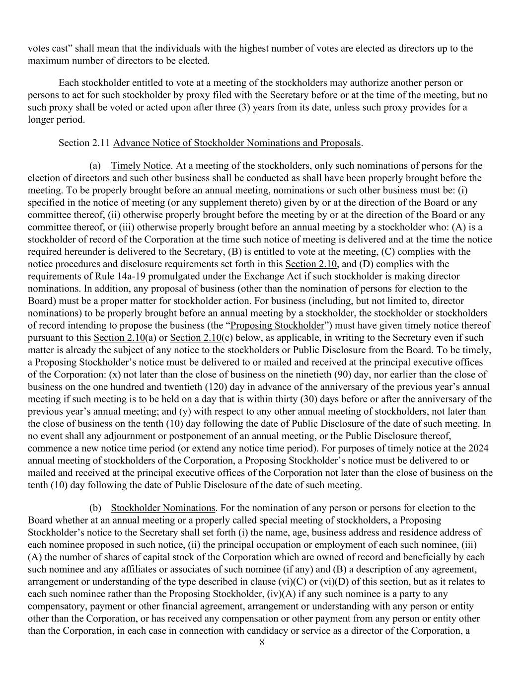 8 votes cast” shall mean that the individuals with the highest number of votes are elected as directors up to the maximum number of directors to be elected. Each stockholder entitled to vote at a meeting of the stockholders may authorize another person or persons to act for such stockholder by proxy filed with the Secretary before or at the time of the meeting, but no such proxy shall be voted or acted upon after three (3) years from its date, unless such proxy provides for a longer period. Section 2.11 Advance Notice of Stockholder Nominations and Proposals. (a) Timely Notice. At a meeting of the stockholders, only such nominations of persons for the election of directors and such other business shall be conducted as shall have been properly brought before the meeting. To be properly brought before an annual meeting, nominations or such other business must be: (i) specified in the notice of meeting (or any supplement thereto) given by or at the direction of the Board or any committee thereof, (ii) otherwise properly brought before the meeting by or at the direction of the Board or any committee thereof, or (iii) otherwise properly brought before an annual meeting by a stockholder who: (A) is a stockholder of record of the Corporation at the time such notice of meeting is delivered and at the time the notice required hereunder is delivered to the Secretary, (B) is entitled to vote at the meeting, (C) complies with the notice procedures and disclosure requirements set forth in this Section 2.10, and (D) complies with the requirements of Rule 14a-19 promulgated under the Exchange Act if such stockholder is making director nominations. In addition, any proposal of business (other than the nomination of persons for election to the Board) must be a proper matter for stockholder action. For business (including, but not limited to, director nominations) to be properly brought before an annual meeting by a stockholder, the stockholder or stockholders of record intending to propose the business (the “Proposing Stockholder”) must have given timely notice thereof pursuant to this Section 2.10(a) or Section 2.10(c) below, as applicable, in writing to the Secretary even if such matter is already the subject of any notice to the stockholders or Public Disclosure from the Board. To be timely, a Proposing Stockholder’s notice must be delivered to or mailed and received at the principal executive offices of the Corporation: (x) not later than the close of business on the ninetieth (90) day, nor earlier than the close of business on the one hundred and twentieth (120) day in advance of the anniversary of the previous year’s annual meeting if such meeting is to be held on a day that is within thirty (30) days before or after the anniversary of the previous year’s annual meeting; and (y) with respect to any other annual meeting of stockholders, not later than the close of business on the tenth (10) day following the date of Public Disclosure of the date of such meeting. In no event shall any adjournment or postponement of an annual meeting, or the Public Disclosure thereof, commence a new notice time period (or extend any notice time period). For purposes of timely notice at the 2024 annual meeting of stockholders of the Corporation, a Proposing Stockholder’s notice must be delivered to or mailed and received at the principal executive offices of the Corporation not later than the close of business on the tenth (10) day following the date of Public Disclosure of the date of such meeting. (b) Stockholder Nominations. For the nomination of any person or persons for election to the Board whether at an annual meeting or a properly called special meeting of stockholders, a Proposing Stockholder’s notice to the Secretary shall set forth (i) the name, age, business address and residence address of each nominee proposed in such notice, (ii) the principal occupation or employment of each such nominee, (iii) (A) the number of shares of capital stock of the Corporation which are owned of record and beneficially by each such nominee and any affiliates or associates of such nominee (if any) and (B) a description of any agreement, arrangement or understanding of the type described in clause (vi)(C) or (vi)(D) of this section, but as it relates to each such nominee rather than the Proposing Stockholder, (iv)(A) if any such nominee is a party to any compensatory, payment or other financial agreement, arrangement or understanding with any person or entity other than the Corporation, or has received any compensation or other payment from any person or entity other than the Corporation, in each case in connection with candidacy or service as a director of the Corporation, a