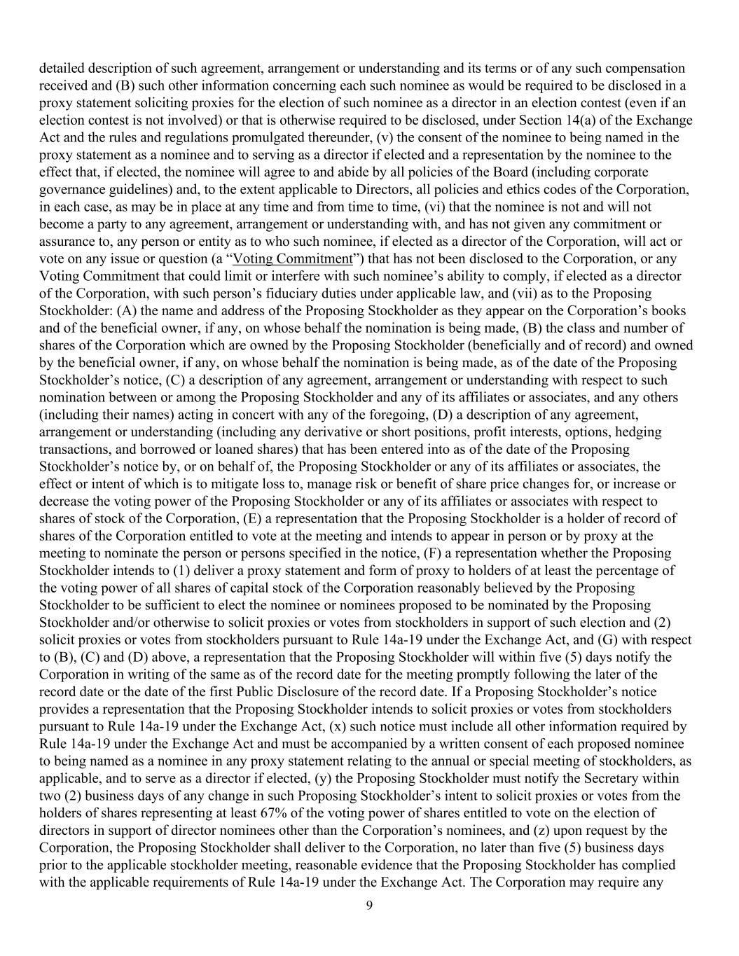 9 detailed description of such agreement, arrangement or understanding and its terms or of any such compensation received and (B) such other information concerning each such nominee as would be required to be disclosed in a proxy statement soliciting proxies for the election of such nominee as a director in an election contest (even if an election contest is not involved) or that is otherwise required to be disclosed, under Section 14(a) of the Exchange Act and the rules and regulations promulgated thereunder, (v) the consent of the nominee to being named in the proxy statement as a nominee and to serving as a director if elected and a representation by the nominee to the effect that, if elected, the nominee will agree to and abide by all policies of the Board (including corporate governance guidelines) and, to the extent applicable to Directors, all policies and ethics codes of the Corporation, in each case, as may be in place at any time and from time to time, (vi) that the nominee is not and will not become a party to any agreement, arrangement or understanding with, and has not given any commitment or assurance to, any person or entity as to who such nominee, if elected as a director of the Corporation, will act or vote on any issue or question (a “Voting Commitment”) that has not been disclosed to the Corporation, or any Voting Commitment that could limit or interfere with such nominee’s ability to comply, if elected as a director of the Corporation, with such person’s fiduciary duties under applicable law, and (vii) as to the Proposing Stockholder: (A) the name and address of the Proposing Stockholder as they appear on the Corporation’s books and of the beneficial owner, if any, on whose behalf the nomination is being made, (B) the class and number of shares of the Corporation which are owned by the Proposing Stockholder (beneficially and of record) and owned by the beneficial owner, if any, on whose behalf the nomination is being made, as of the date of the Proposing Stockholder’s notice, (C) a description of any agreement, arrangement or understanding with respect to such nomination between or among the Proposing Stockholder and any of its affiliates or associates, and any others (including their names) acting in concert with any of the foregoing, (D) a description of any agreement, arrangement or understanding (including any derivative or short positions, profit interests, options, hedging transactions, and borrowed or loaned shares) that has been entered into as of the date of the Proposing Stockholder’s notice by, or on behalf of, the Proposing Stockholder or any of its affiliates or associates, the effect or intent of which is to mitigate loss to, manage risk or benefit of share price changes for, or increase or decrease the voting power of the Proposing Stockholder or any of its affiliates or associates with respect to shares of stock of the Corporation, (E) a representation that the Proposing Stockholder is a holder of record of shares of the Corporation entitled to vote at the meeting and intends to appear in person or by proxy at the meeting to nominate the person or persons specified in the notice, (F) a representation whether the Proposing Stockholder intends to (1) deliver a proxy statement and form of proxy to holders of at least the percentage of the voting power of all shares of capital stock of the Corporation reasonably believed by the Proposing Stockholder to be sufficient to elect the nominee or nominees proposed to be nominated by the Proposing Stockholder and/or otherwise to solicit proxies or votes from stockholders in support of such election and (2) solicit proxies or votes from stockholders pursuant to Rule 14a-19 under the Exchange Act, and (G) with respect to (B), (C) and (D) above, a representation that the Proposing Stockholder will within five (5) days notify the Corporation in writing of the same as of the record date for the meeting promptly following the later of the record date or the date of the first Public Disclosure of the record date. If a Proposing Stockholder’s notice provides a representation that the Proposing Stockholder intends to solicit proxies or votes from stockholders pursuant to Rule 14a-19 under the Exchange Act, (x) such notice must include all other information required by Rule 14a-19 under the Exchange Act and must be accompanied by a written consent of each proposed nominee to being named as a nominee in any proxy statement relating to the annual or special meeting of stockholders, as applicable, and to serve as a director if elected, (y) the Proposing Stockholder must notify the Secretary within two (2) business days of any change in such Proposing Stockholder’s intent to solicit proxies or votes from the holders of shares representing at least 67% of the voting power of shares entitled to vote on the election of directors in support of director nominees other than the Corporation’s nominees, and (z) upon request by the Corporation, the Proposing Stockholder shall deliver to the Corporation, no later than five (5) business days prior to the applicable stockholder meeting, reasonable evidence that the Proposing Stockholder has complied with the applicable requirements of Rule 14a-19 under the Exchange Act. The Corporation may require any